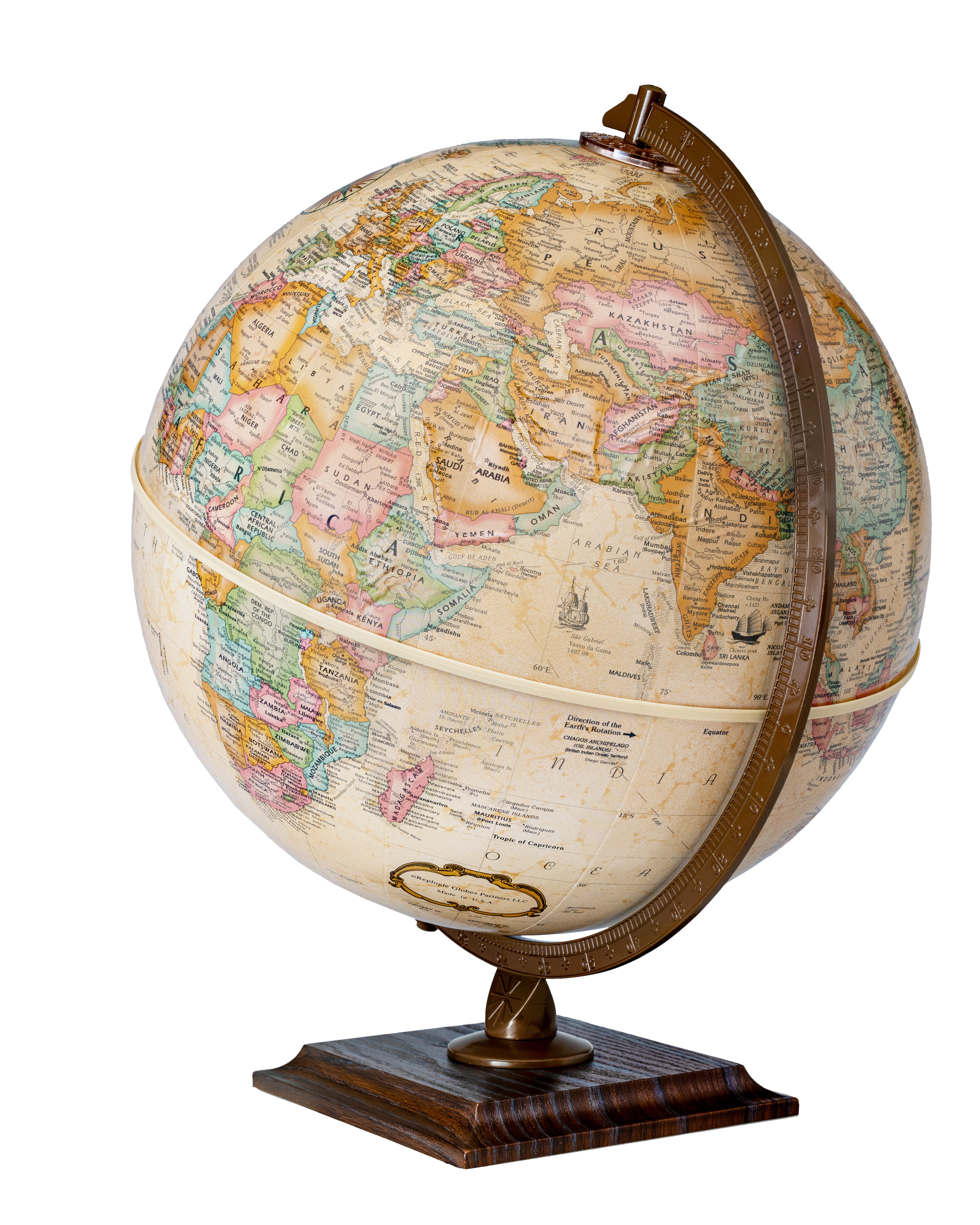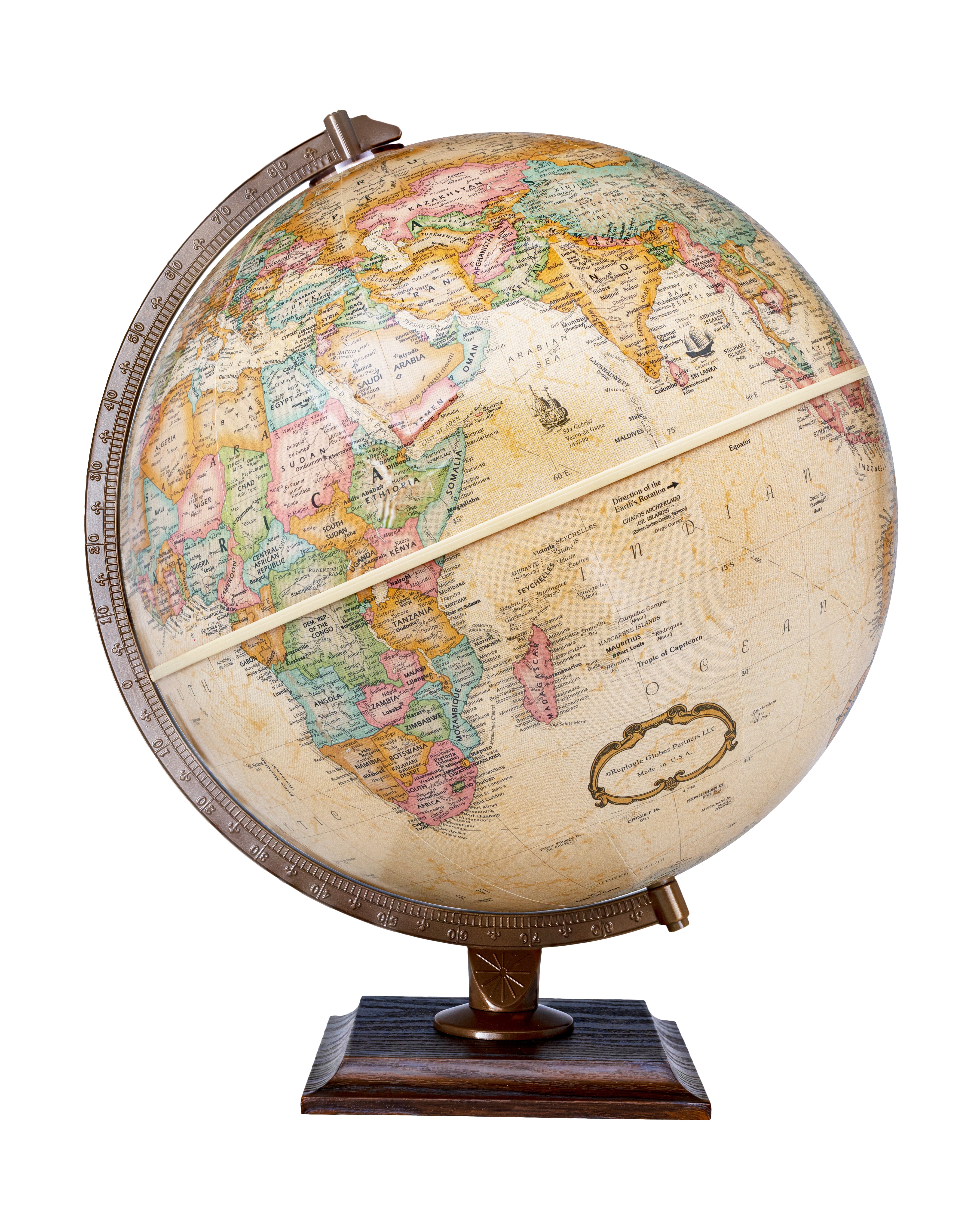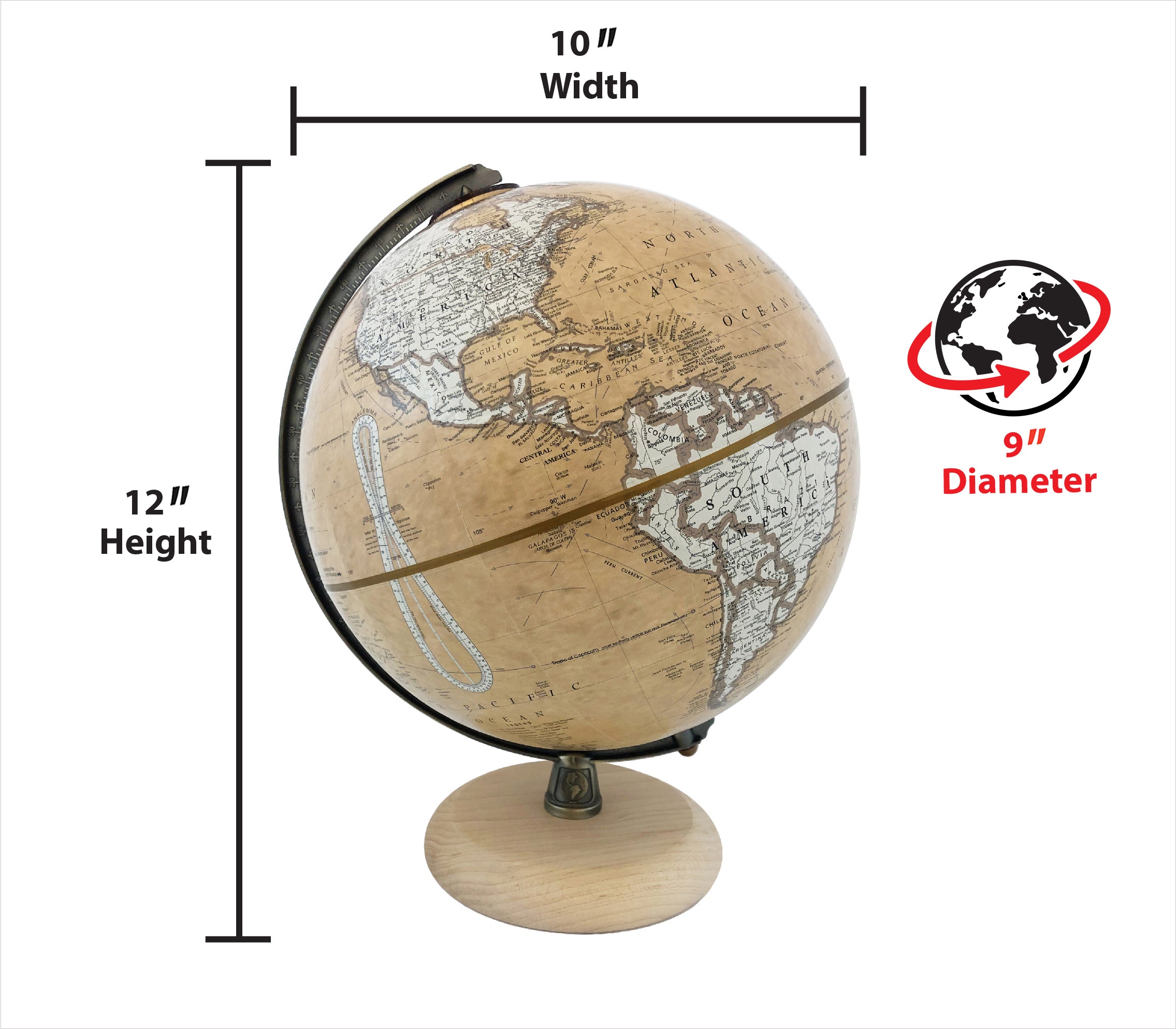 Easy To Assemble World Classis Globe 12" Diameter Antique Ocean Globe with Wood Base and Numbered Semi-Meridian
