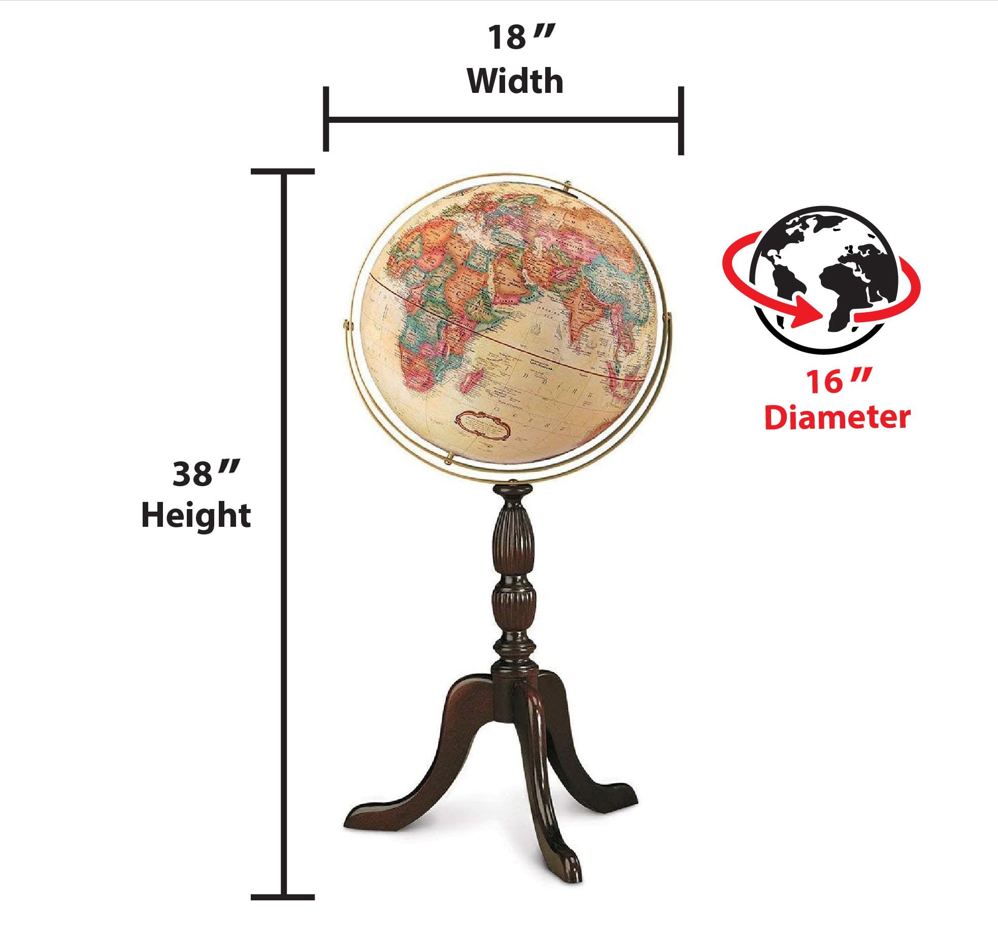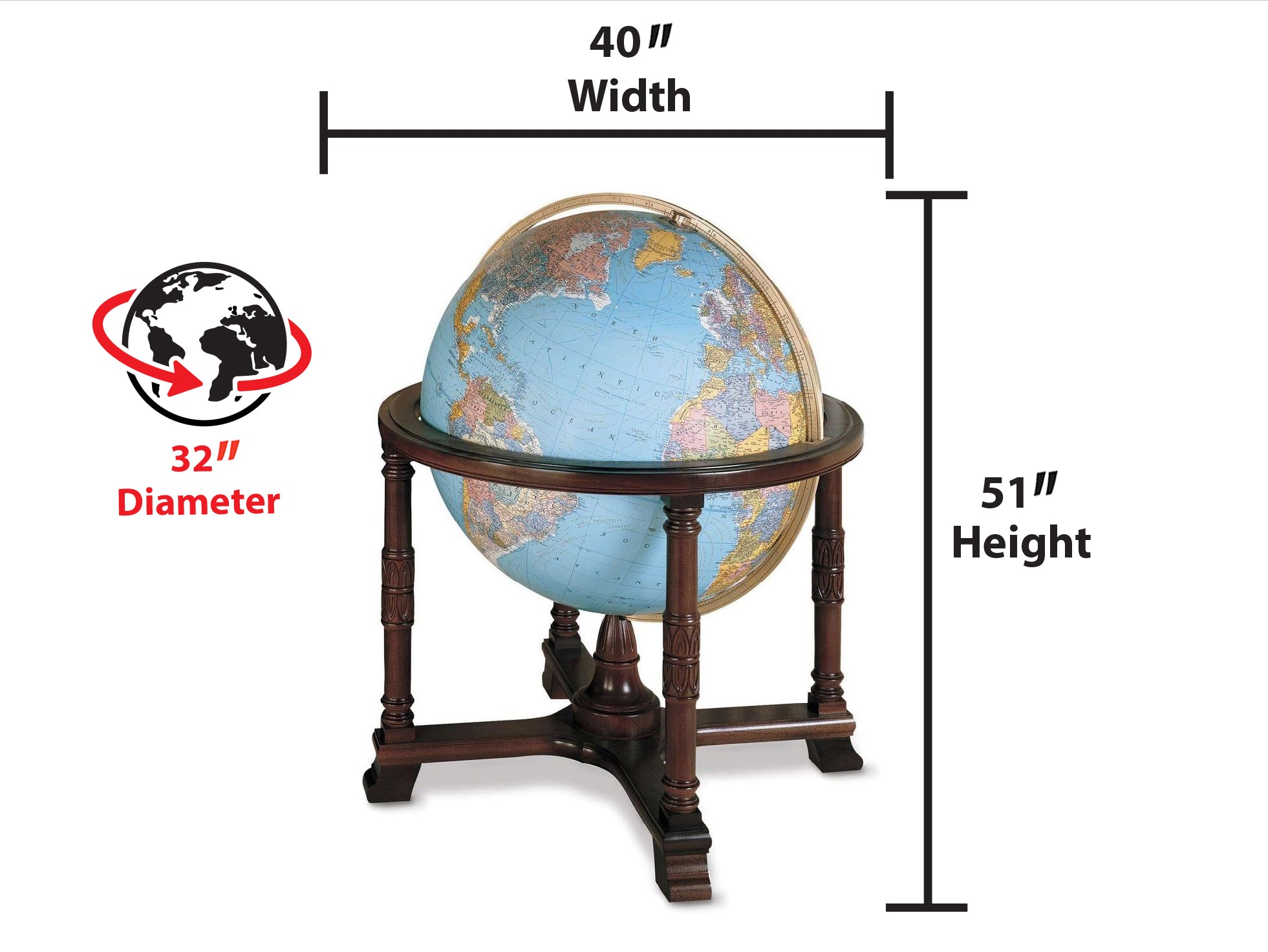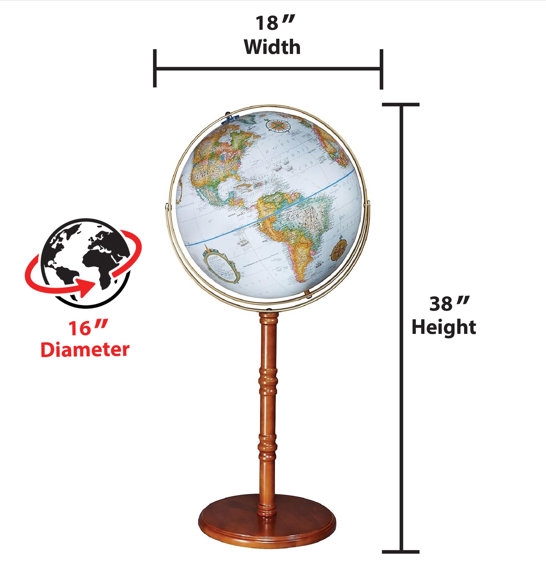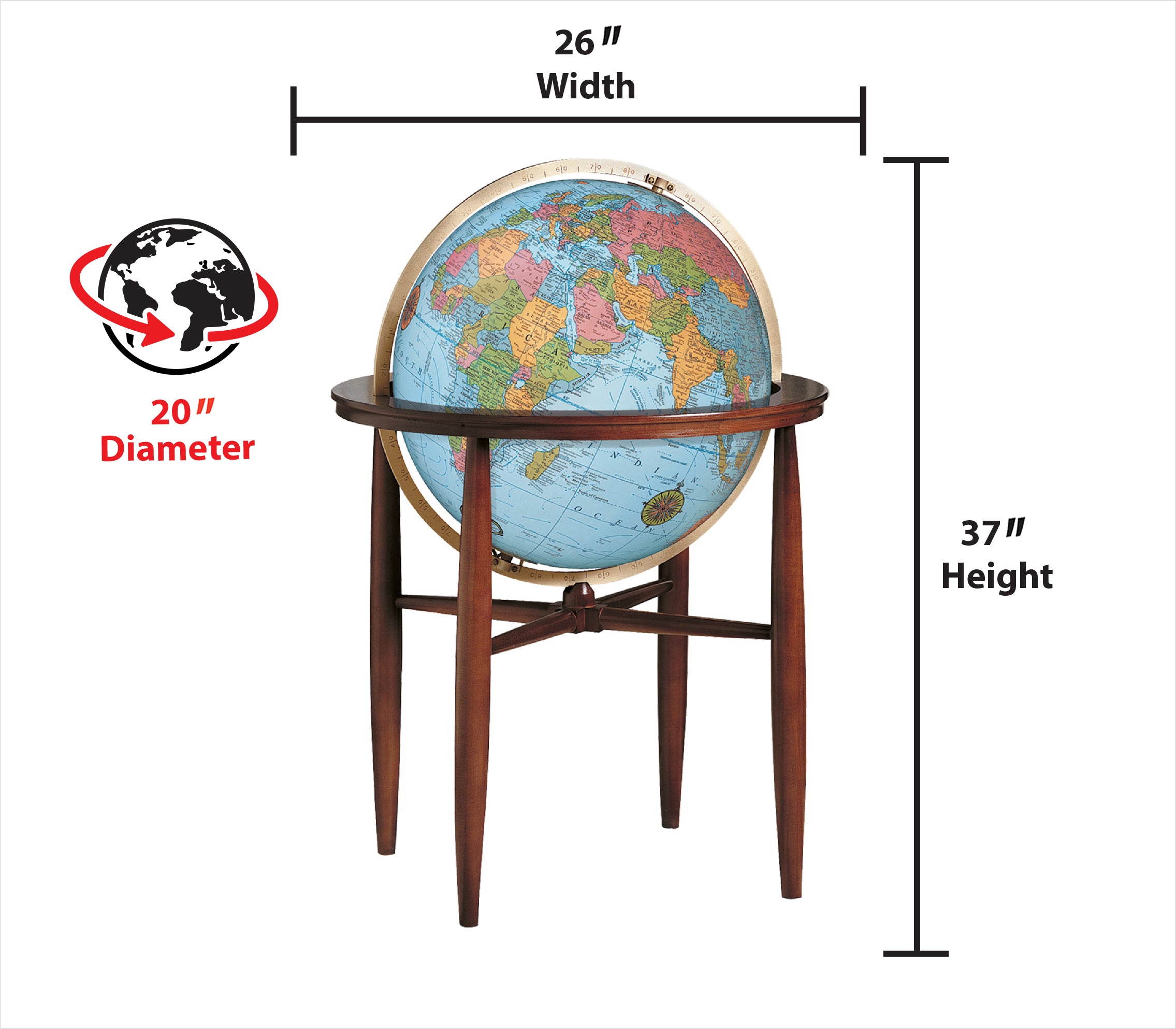 Easy To Assemble World Classis Globe 12" Diameter Antique Ocean Globe with Wood Base and Numbered Semi-Meridian