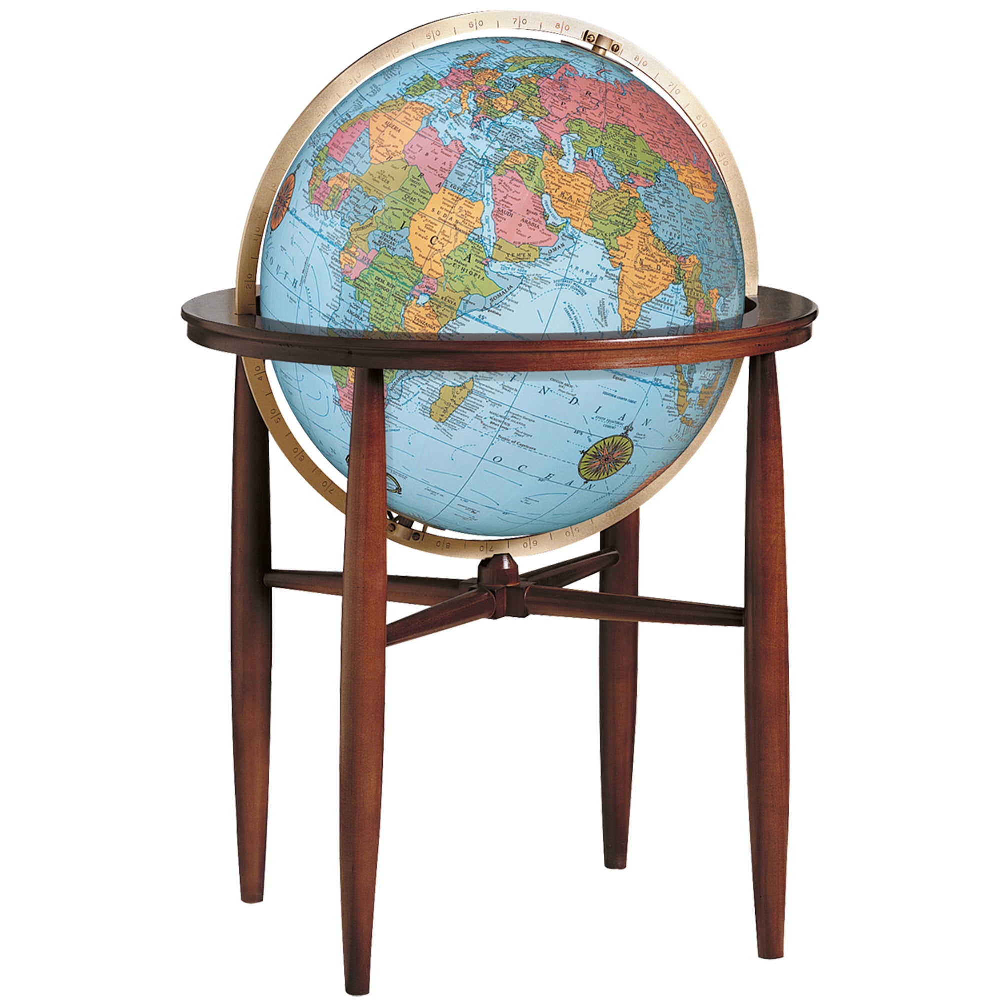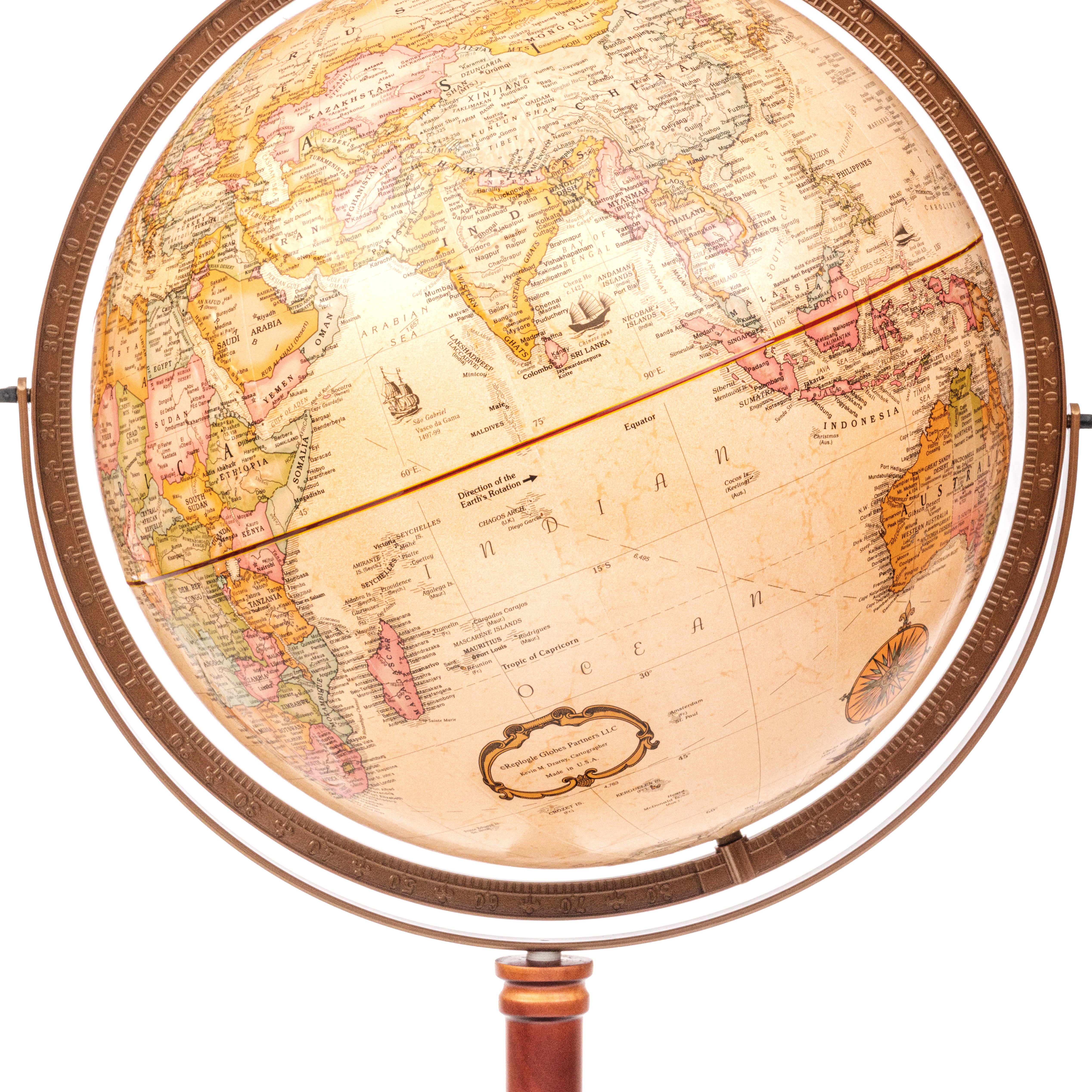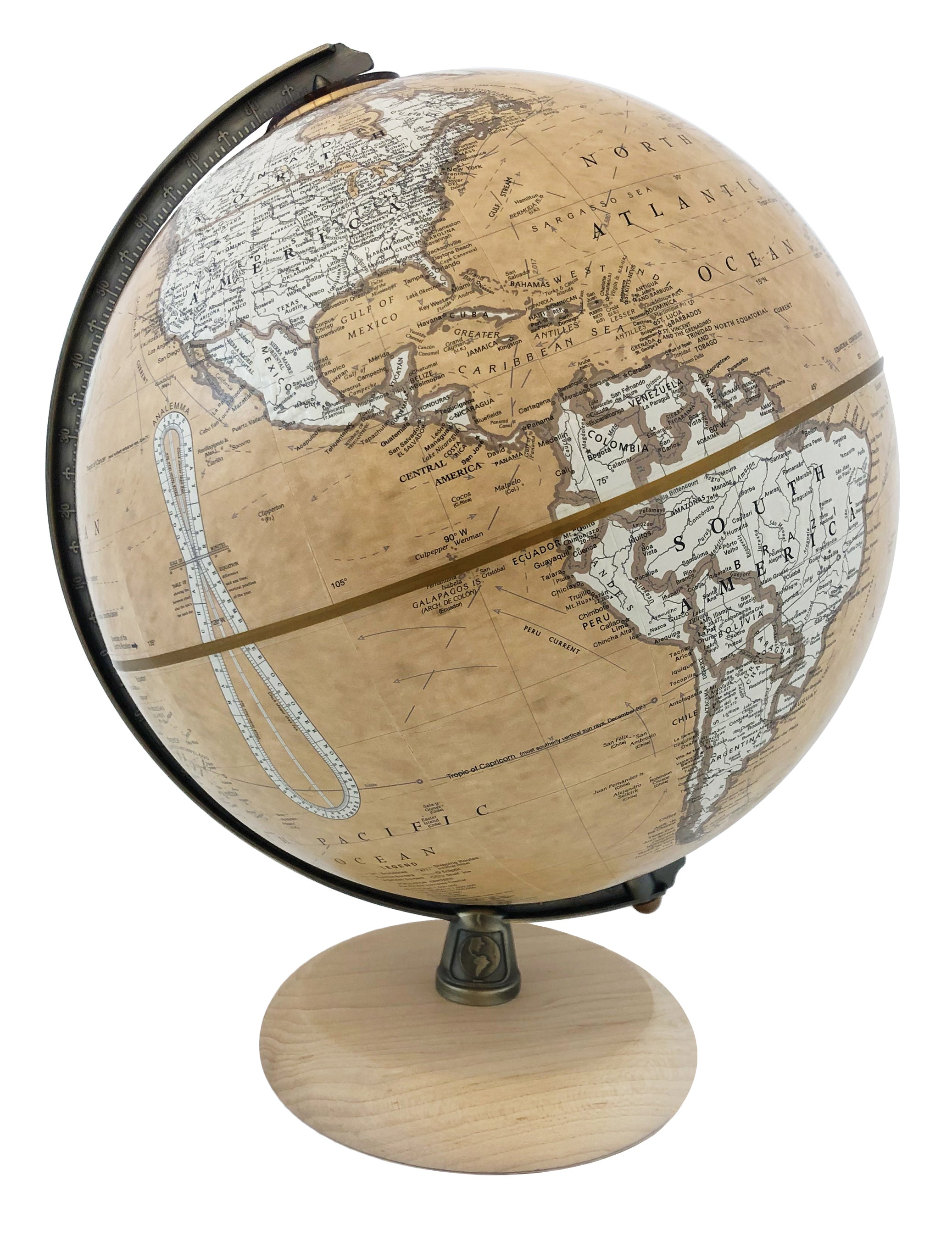 Compass Rose 12" Diameter Antique Ocean Globe with Diecast Base and Numbered Semi-Meridian