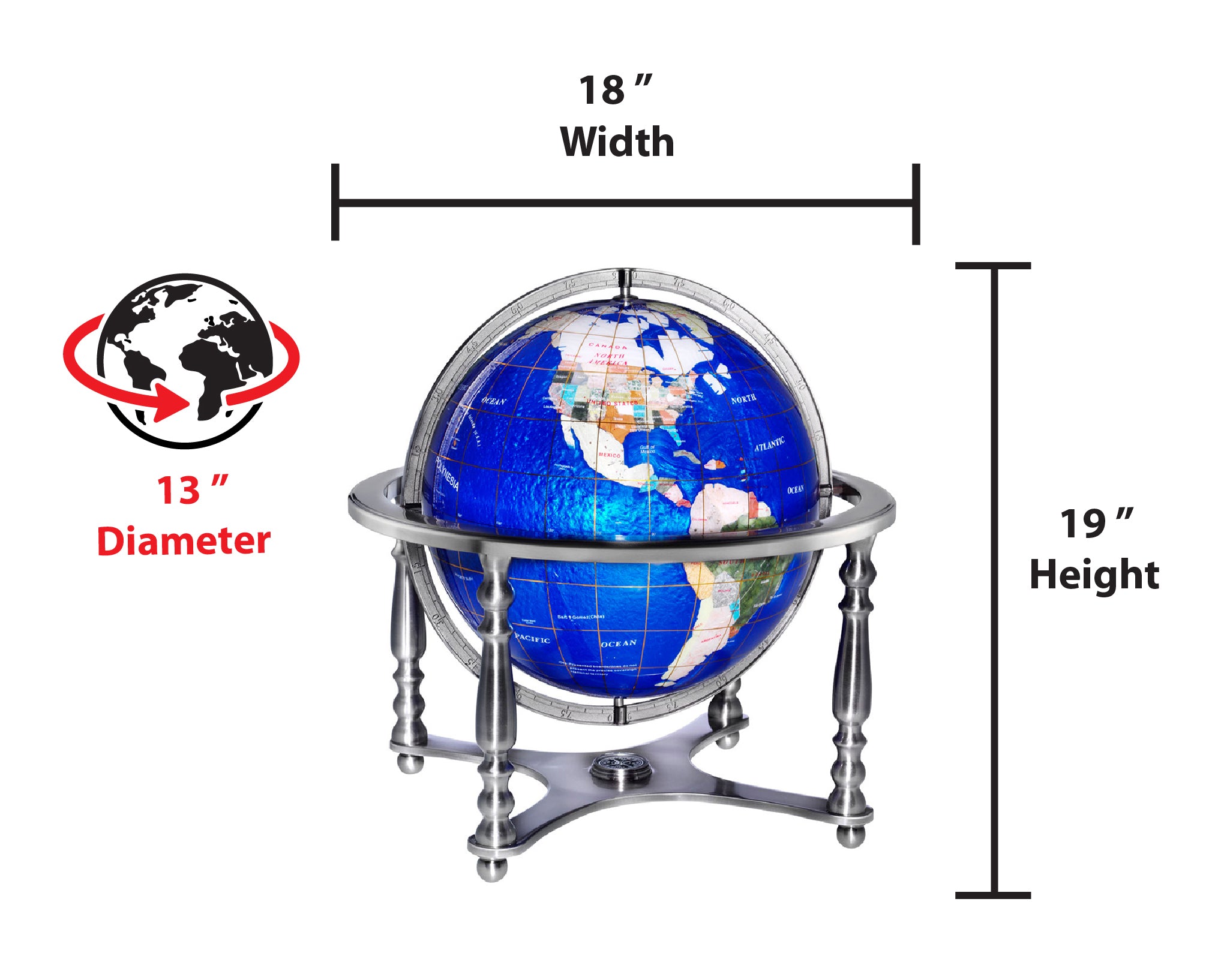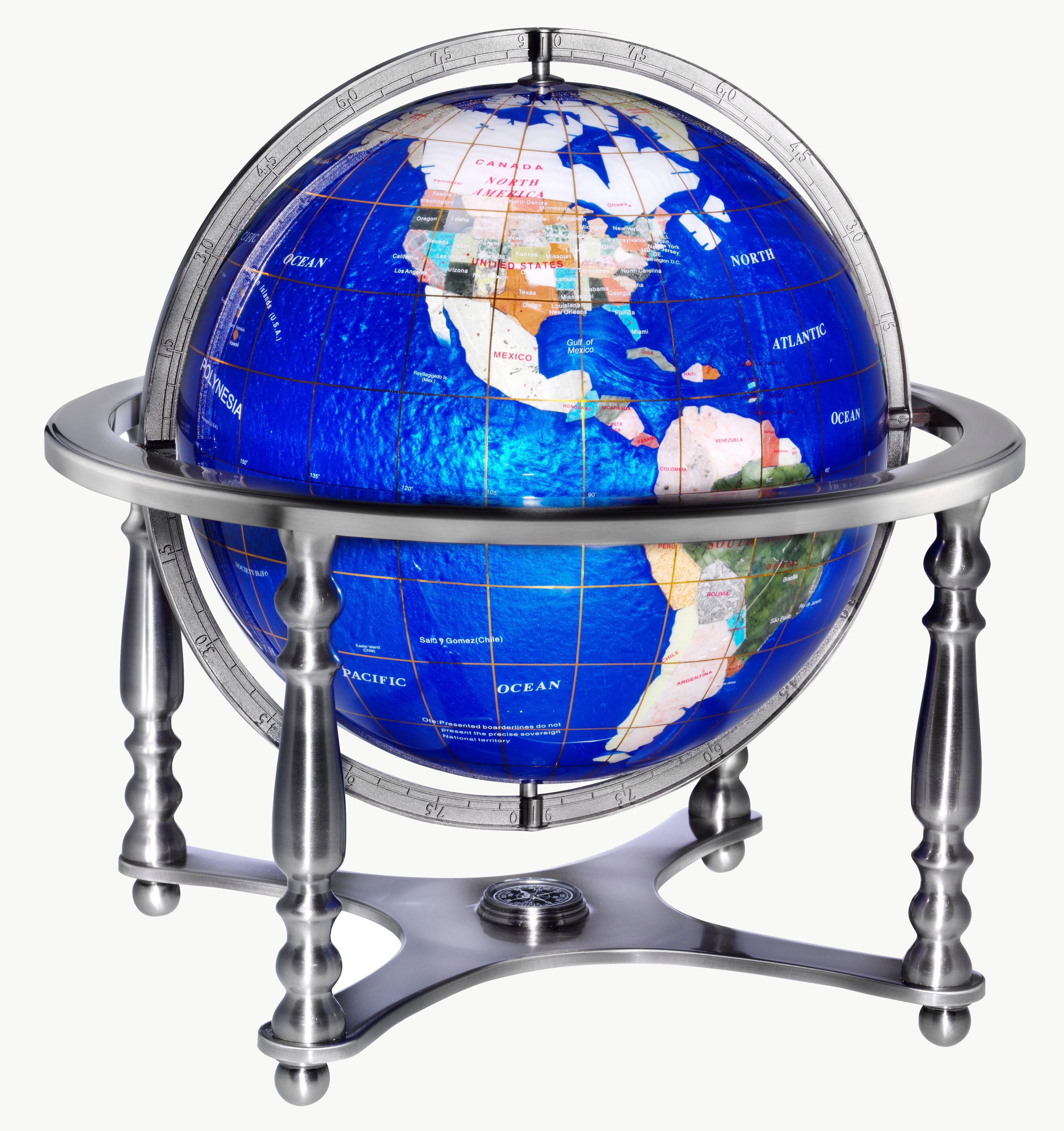 Compass Jewel 13" Diameter Blue Ocean Gemstone Globe with Brushed Silver Metal Base and Decorative Meridian