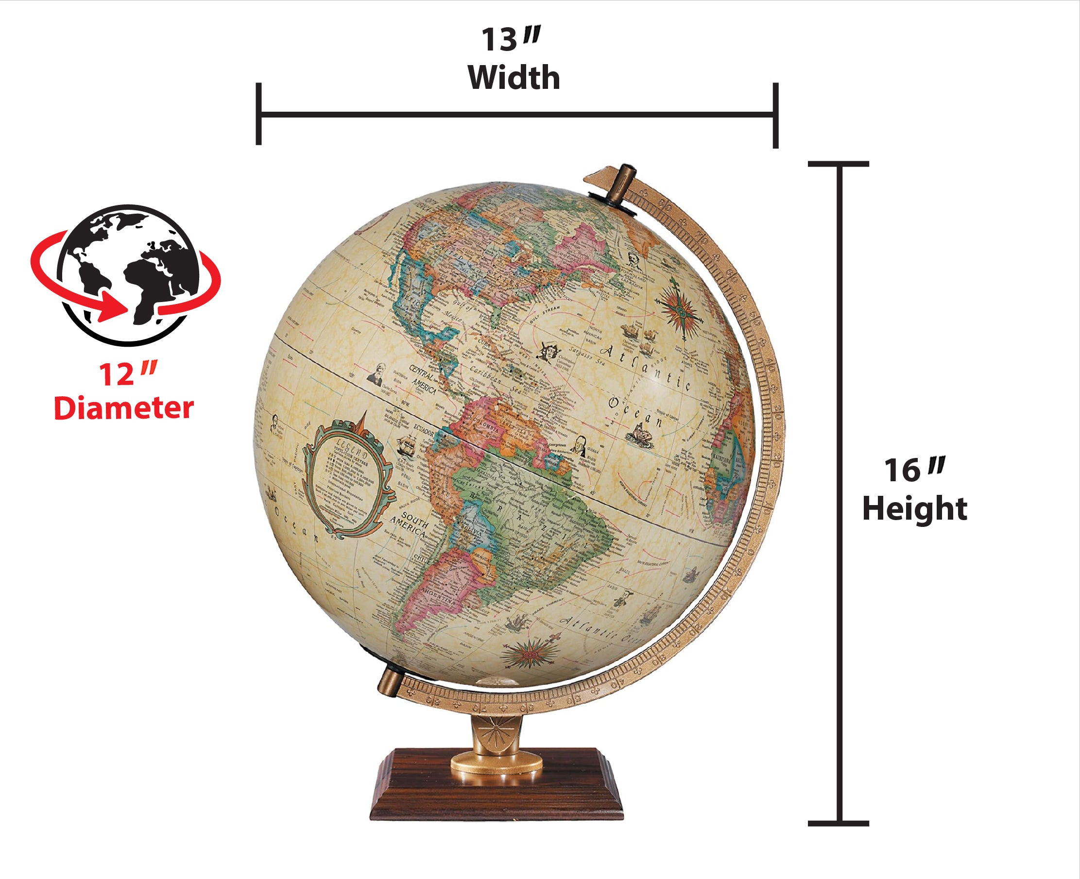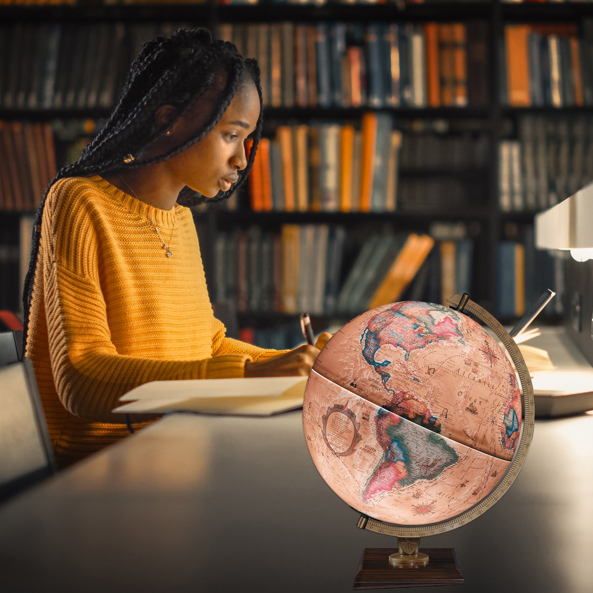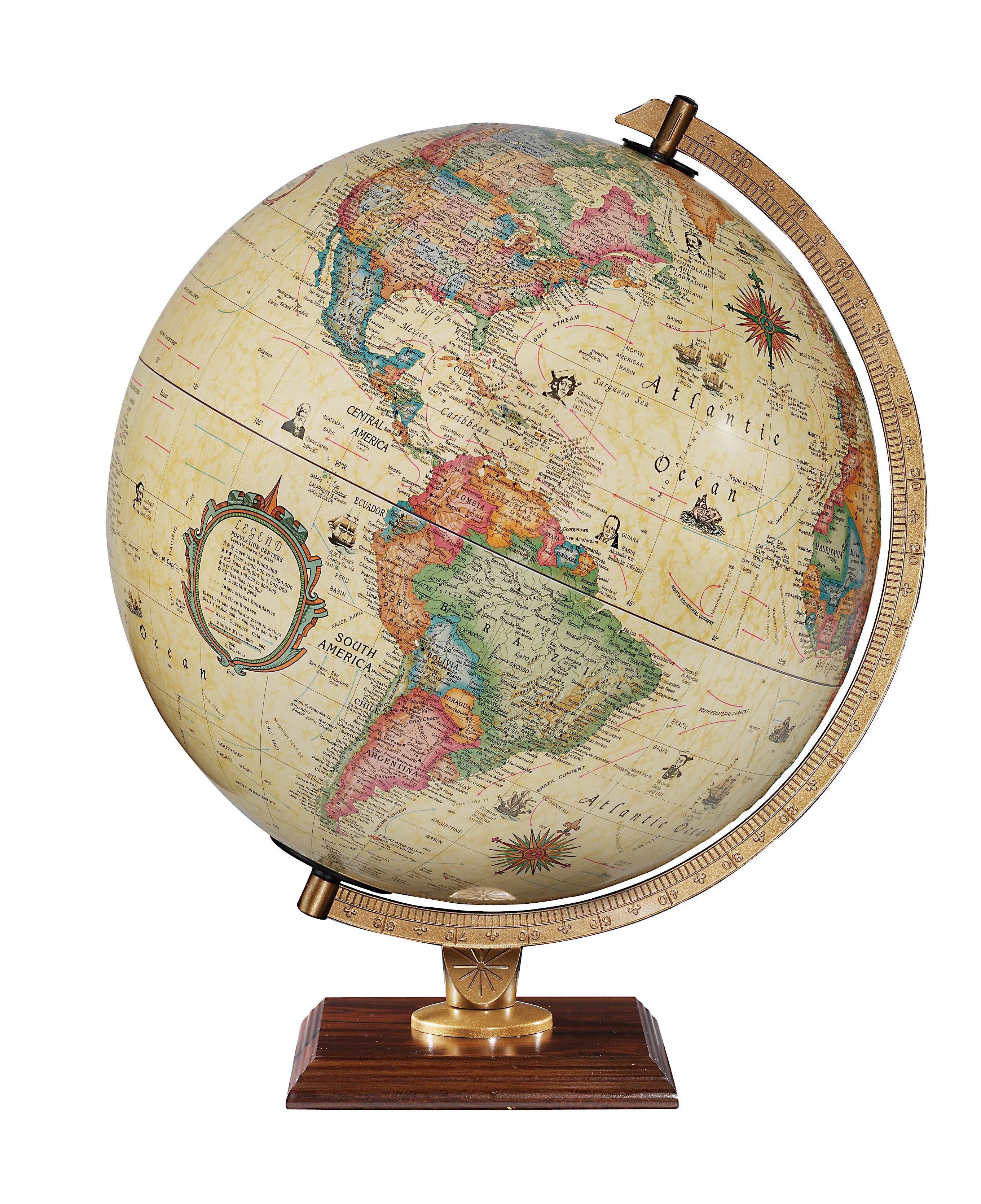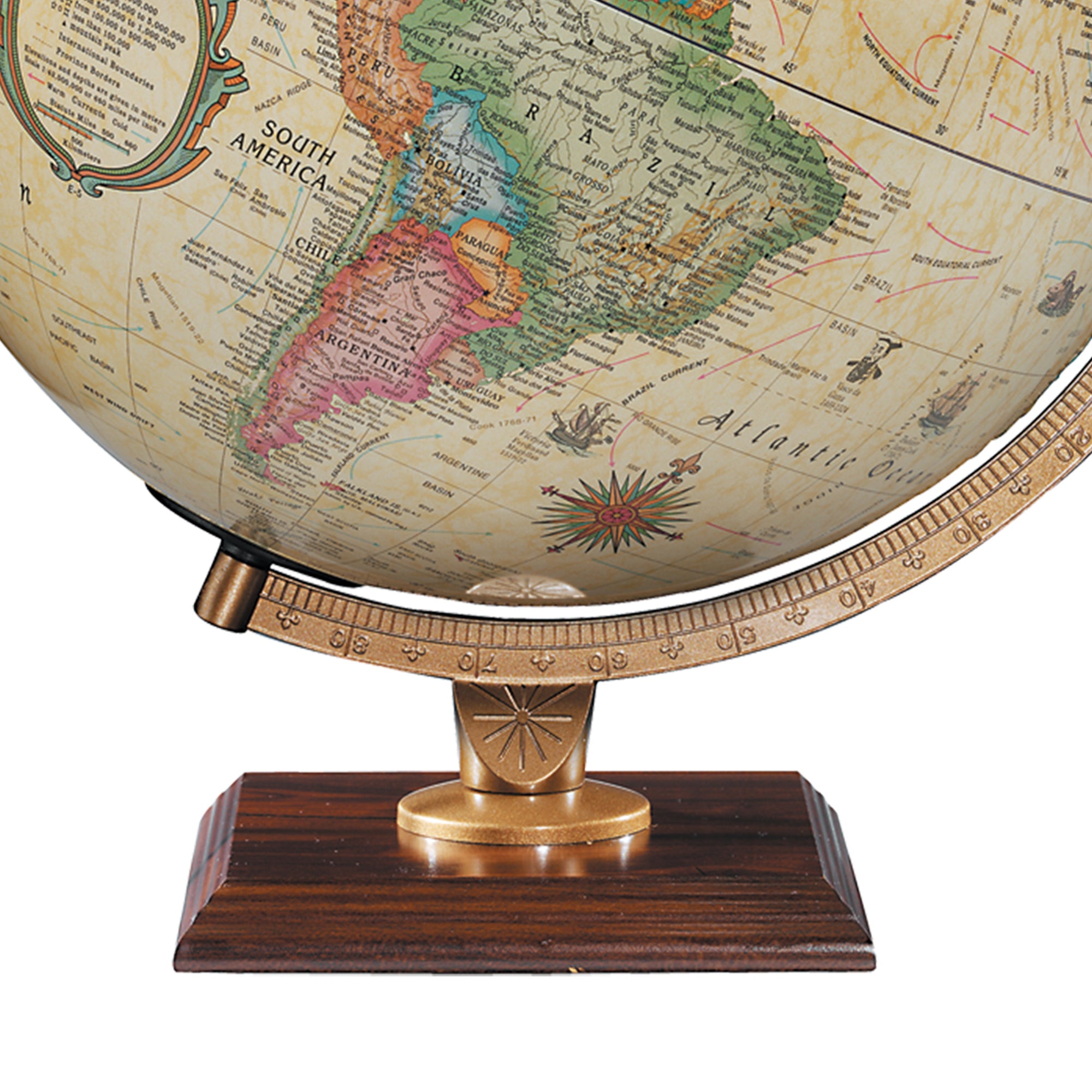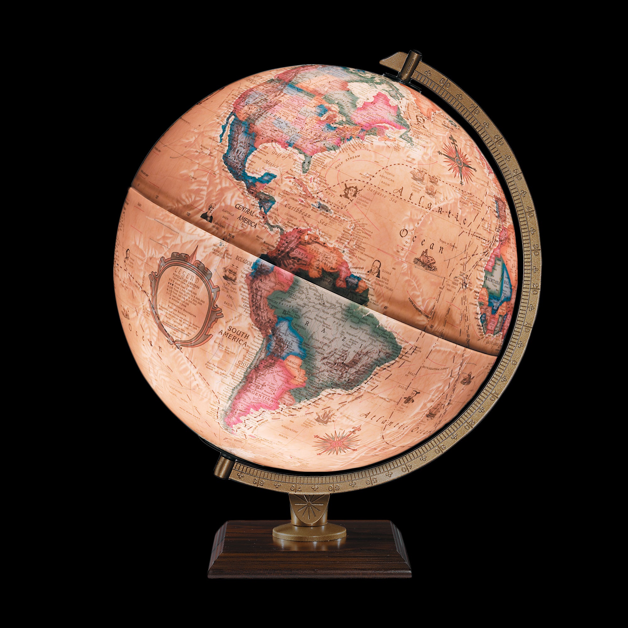 Carlyle Illuminated 12" Diameter, Up to Date Cartography, with Antique Ocean Globe Ball and Walnut Finished Base. The Carlyle globe is the only antique style desktop globe to feature both raised relief and illumination. Run your fingers over raised mountain ranges and feel the Andes, Himalayas, and other major mountains. When illuminated, additional features appear, such as the routes of major explorer expeditions, and view ocean floor features such as mid ocean trenches, seamounts, basins and ridges.