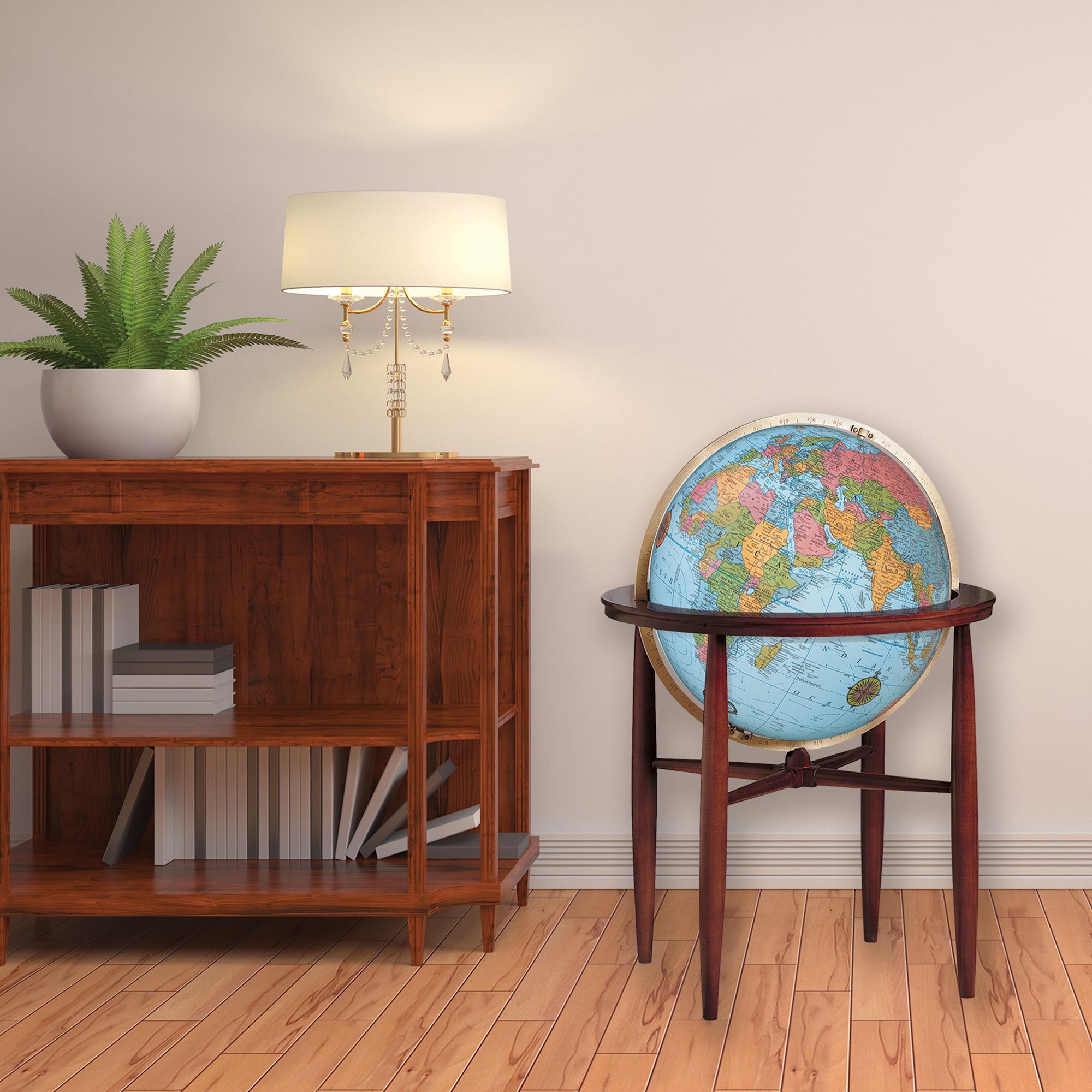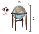 The Finley’s impressive 37”/93 cm height and simple lines provide an attractive backdrop for its 20”/50 cm illuminated globe ball with hand-applied, hand-cut map. Full engraved