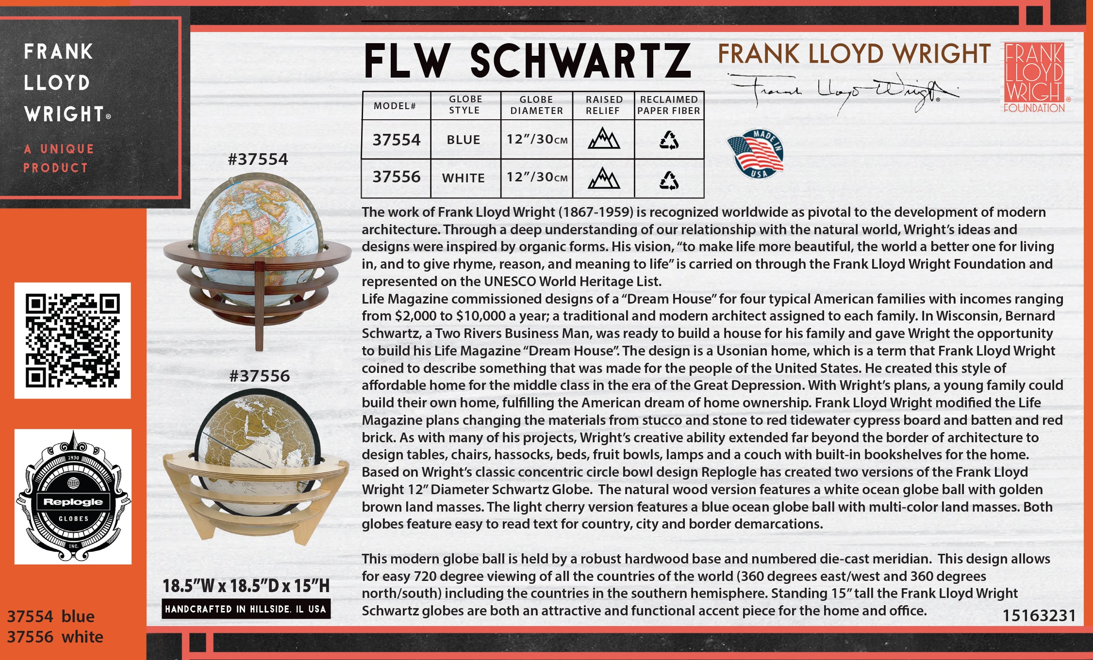 American families with incomes ranging from $2,000 to $10,000 a year; a traditional and modern architect were assigned to each family. In Wisconsin, Bernard Schwartz, a Two Rivers Business Man, was ready to build a house for his family and gave Wright the opportunity to build his Life Magazine “Dream House”. Wright modified the Life Magazine plans, changing the materials from stucco and stone to red tidewater cypress board and batten and red brick. Wright went on to design tables, chairs, hassocks, beds, fruit bowls, lamps and a couch with built-in bookshelves for the home. Based on Mr. Wrights classic bowl design Replogle has created two versions of the Frank Lloyd Wright 12” Diameter Schwartz Globe. The natural wood version features a white ocean globe ball with golden brown land masses. The Globe ball features easy to read text for country, city and border demarcations. This modern globe ball is held by a robust hardwood base and numbered die-cast meridian. This design allows for easy 720 degree viewing of all the countries of the world (360 degrees east/west and 360 degrees north/south) including the countries in the Southern Hemisphere. Standing 15” tall, the Frank Lloyd Wright Schwartz globes