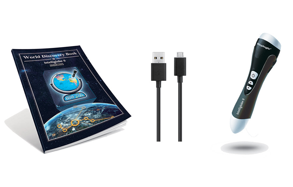 The Intelliglobe Combo includes Intelliglobe II Pen, 60 page World Discovery Book and Micro USB cord. The pen and book can be used with Intelliglobe II and also with special globes that are Intellienabled.