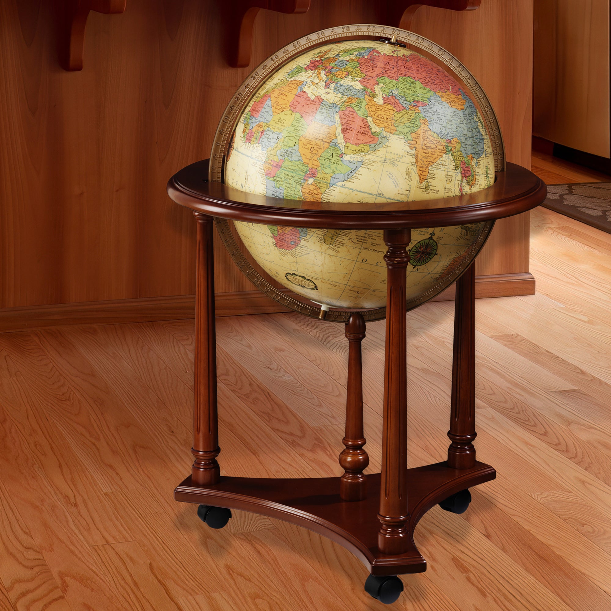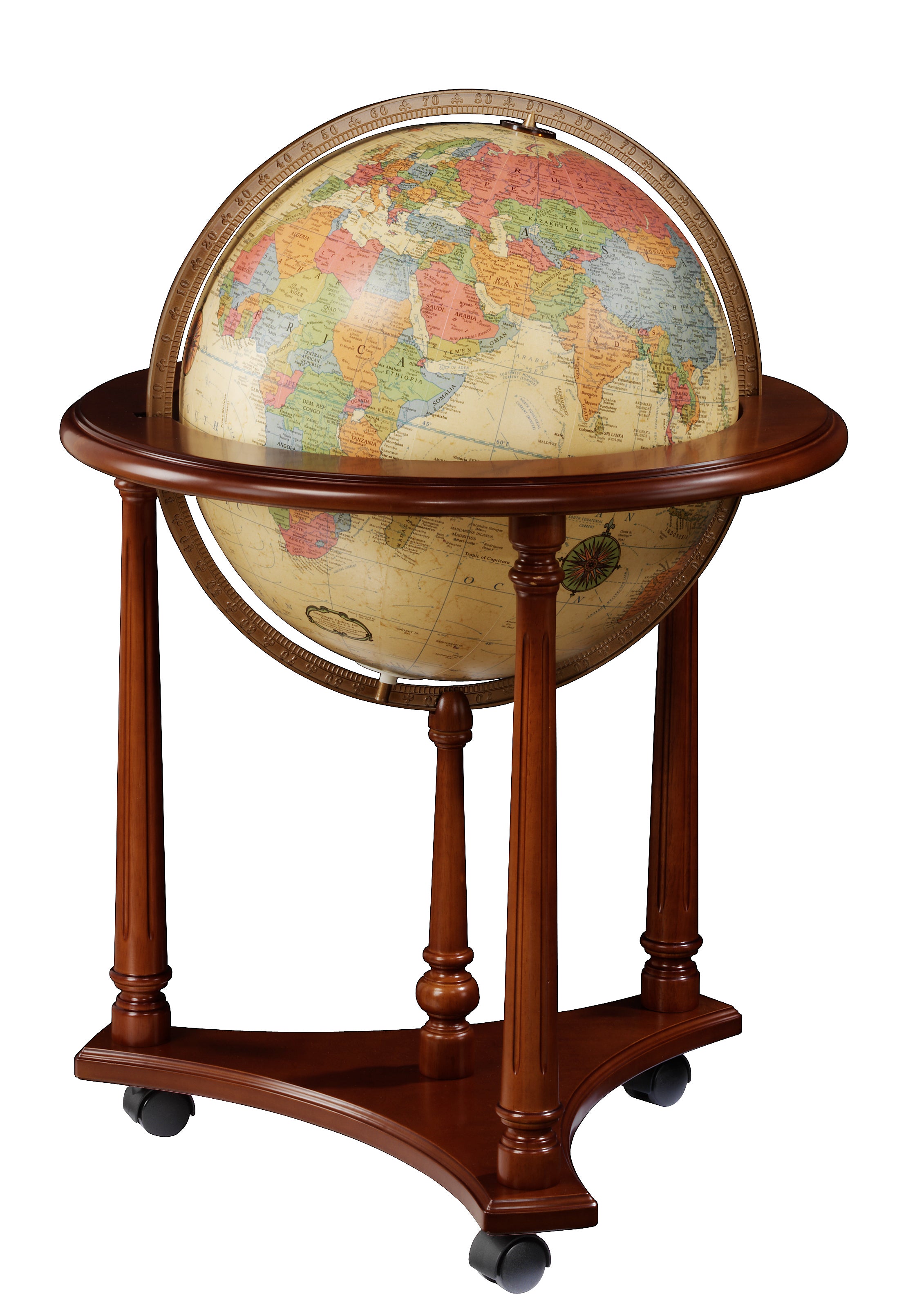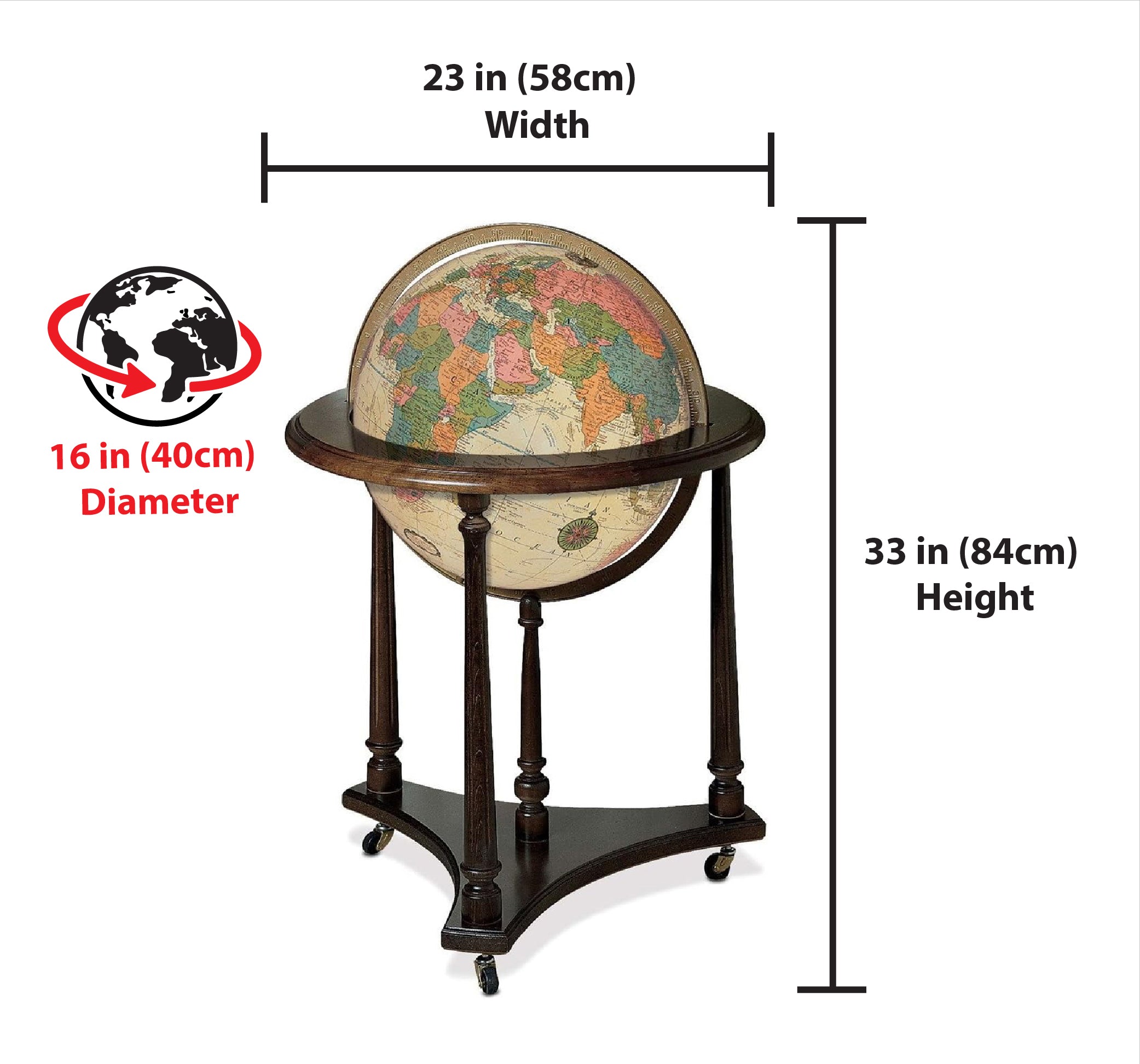 Lafayette 16" Diameter Illuminated Globe, USA Cartography with Solid Hardwood Walnut Finished Stand. Explore the world and let it inspire you. The Lafayette, standing 33”/84 cm tall and featuring an illuminated ball, walnut-finish base, and full die-cast meridian, is ideal for chair-side viewing. Aesthetically pleasing and practical, this is a globe to be admired for years to come. Hand-covered antique globe.