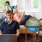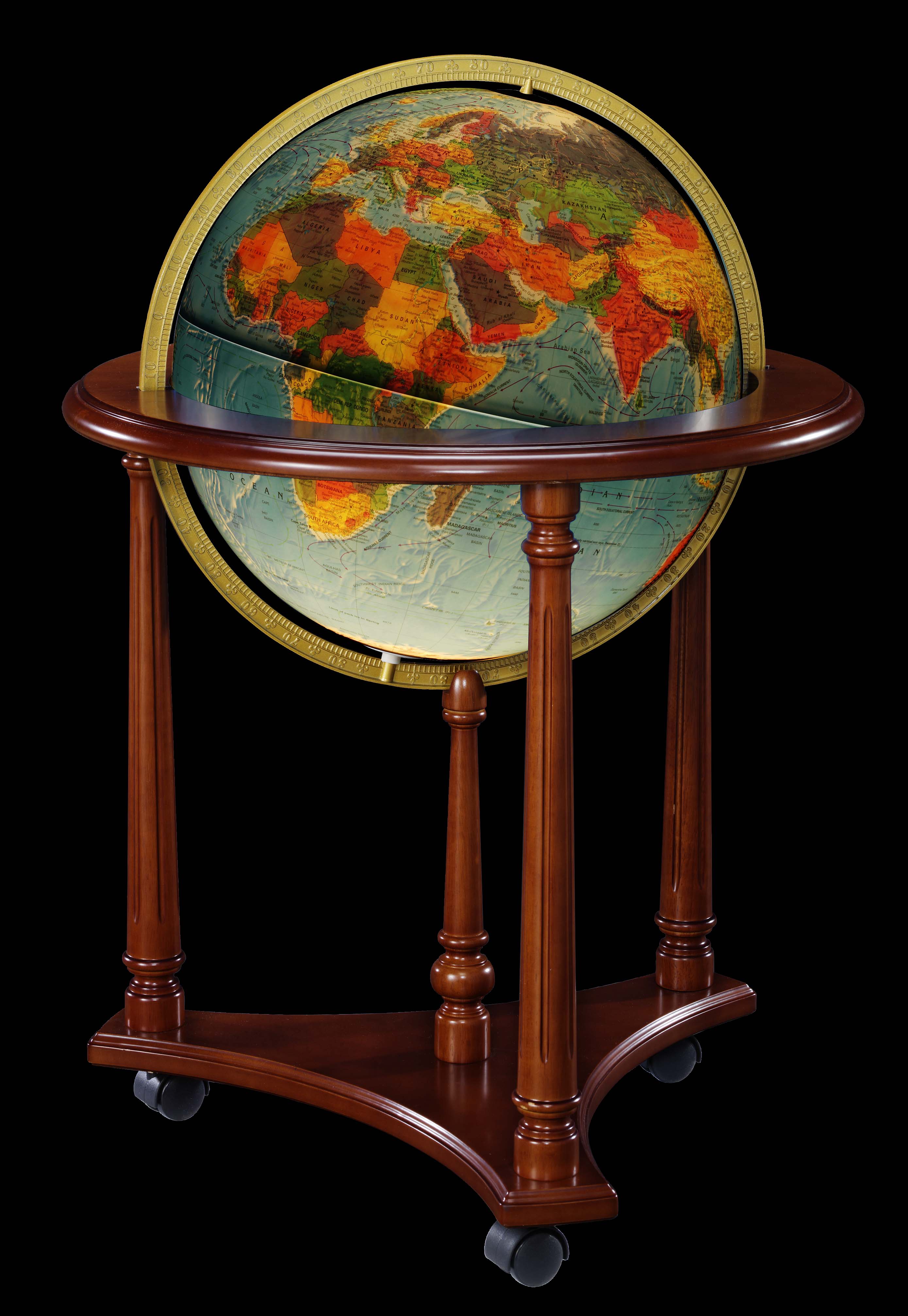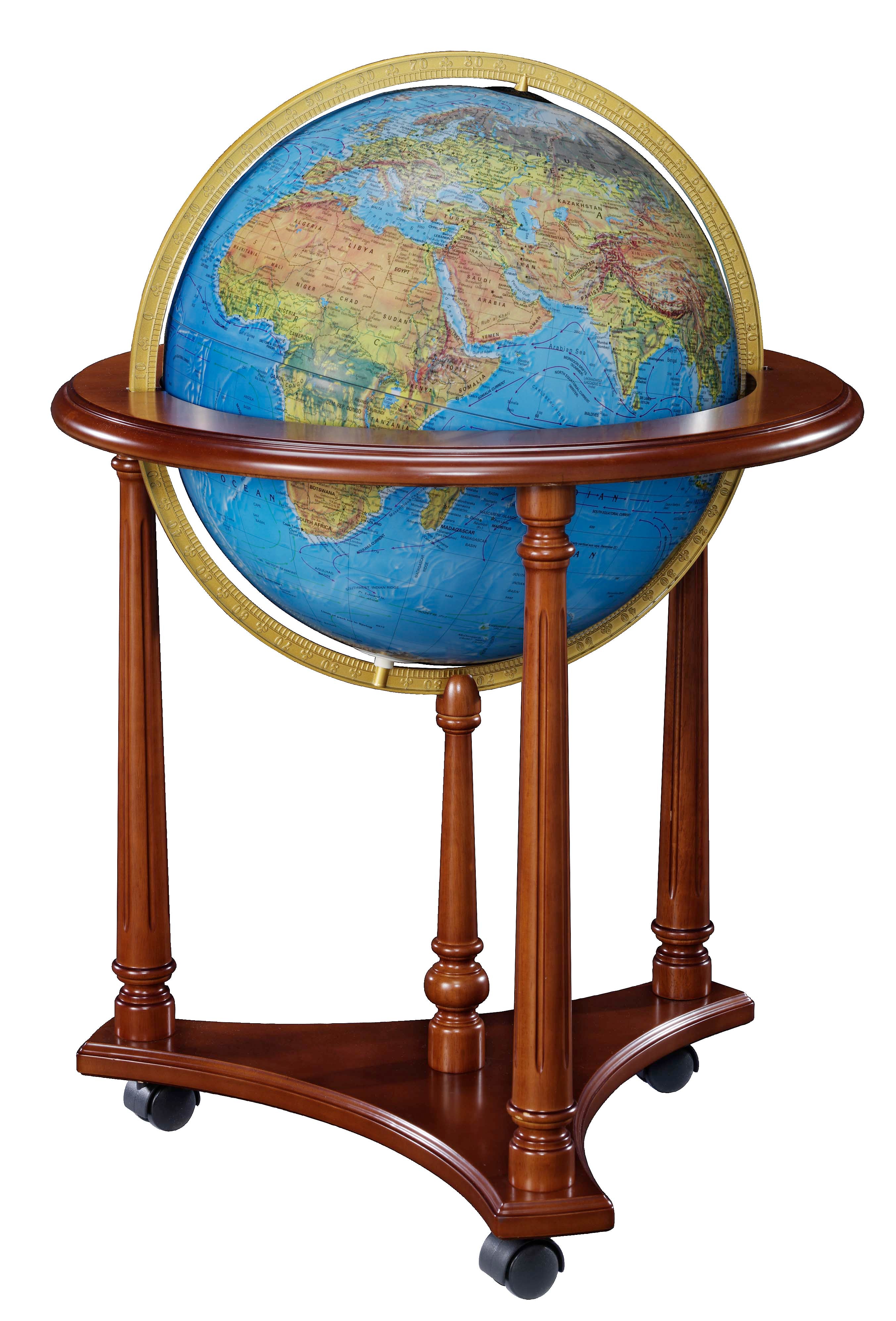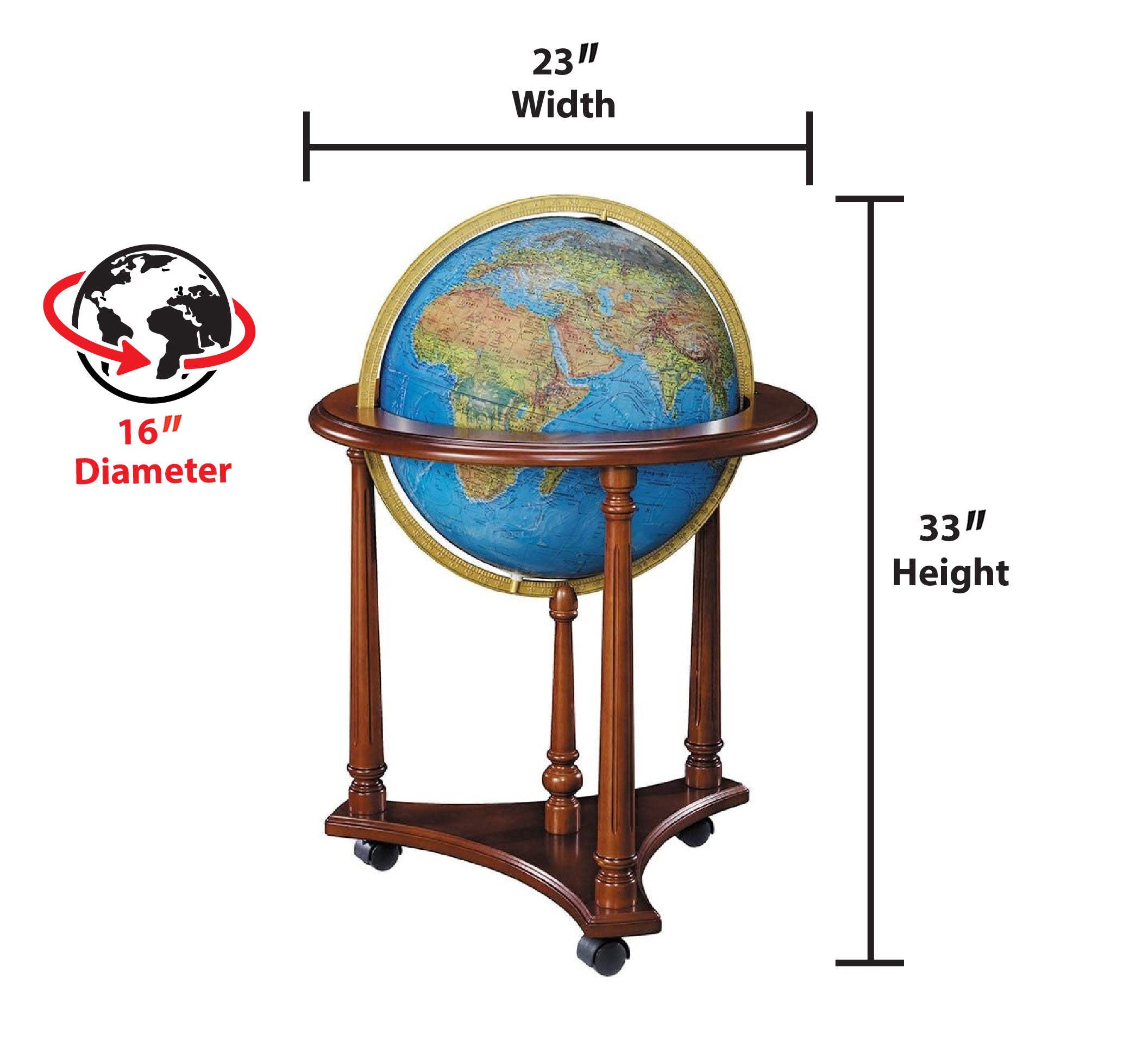 Lafayette 16" Diameter Illuminated Globe, USA Cartography with Solid Hardwood Walnut Finished Stand. Explore the world and let it inspire you. The Lafayette, standing  33”/84 cm tall and featuring a blue ocean illuminated ball, walnut-finish  base, and full die-cast meridian, is ideal for chair-side viewing.  Aesthetically pleasing and practical, this is a globe to be admired for years.