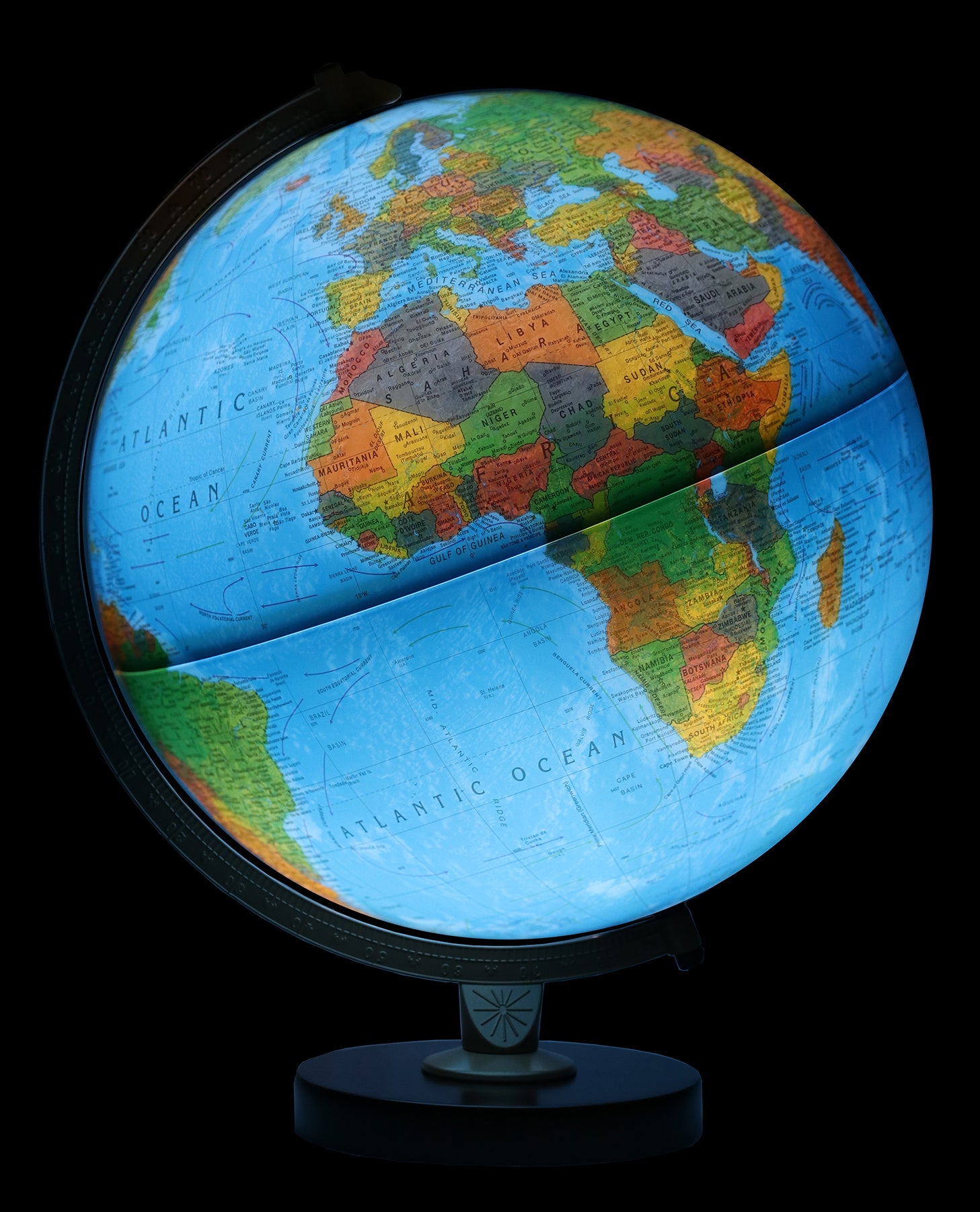 Turn on the inline switch and the Livingston globe with its energy saving LED bulb revealing the political world with border and critical lines of demarcation. When not illuminated, this globe takes on new dimensions as a topographical map with a physical representation view of the earth.