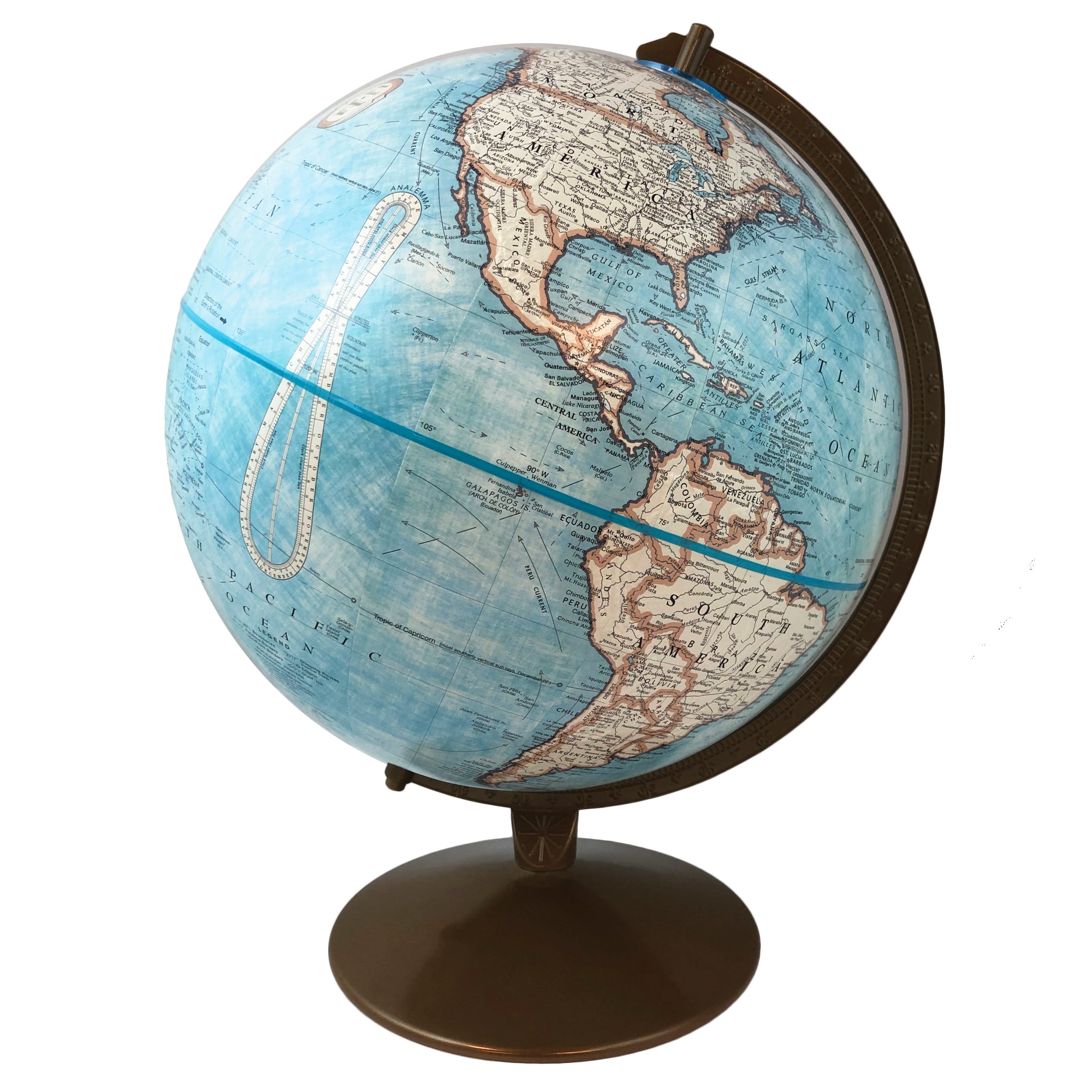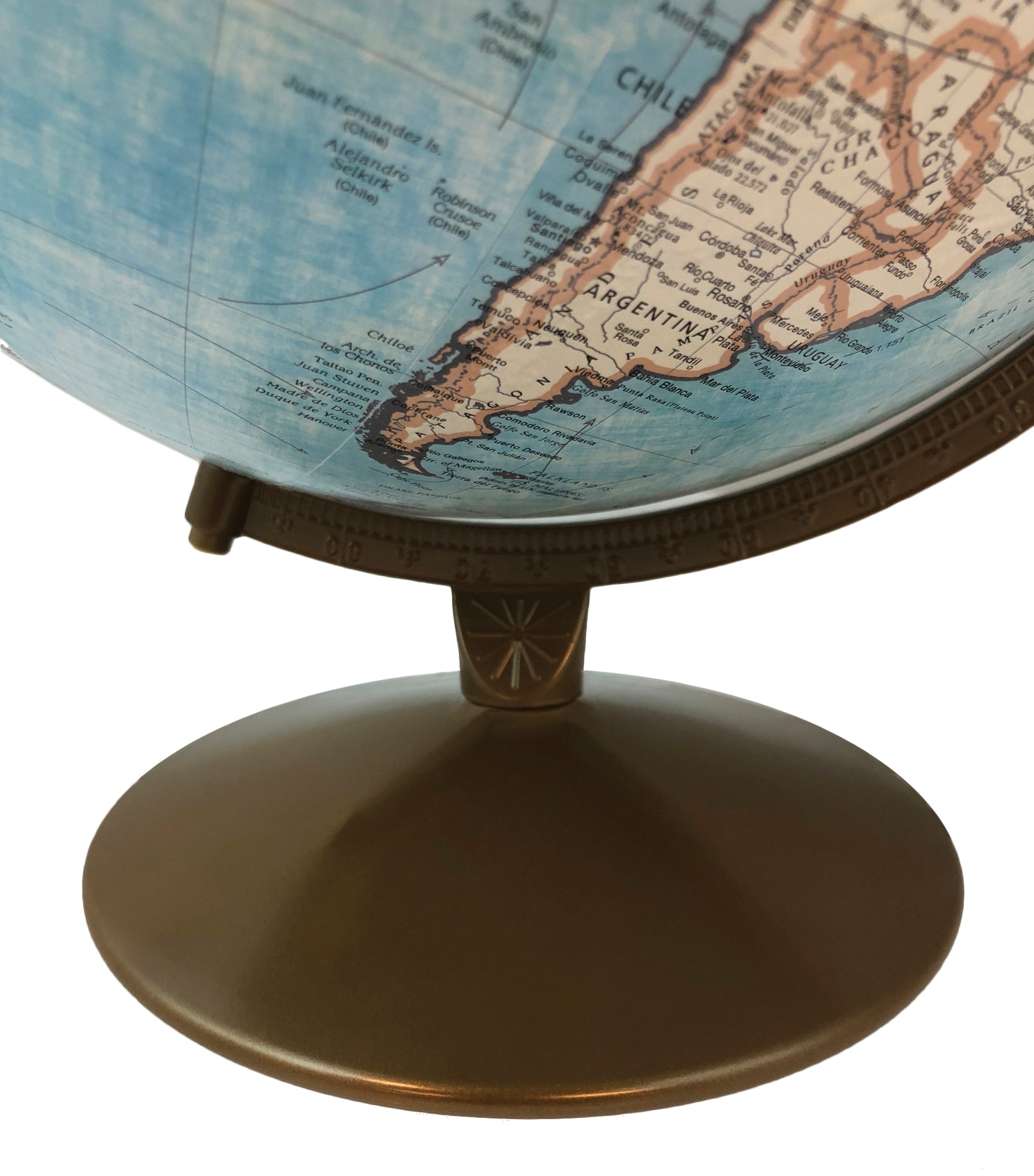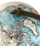 Trail Blazer Globe Features Political map styling with raised relief 12-inch world globe is ideal for desktops. This beautiful blue ocean globe contains more than 3,000 location names and distinctive political boundary markings. Perfect for sparking interesting conversations and perfect for geography lessons. Made in the USA this beautiful globe includes a classic brownish gold-colored base and semi-meridian for a sophisticated look. The perfect globe for any home decor and also a great teaching tool.