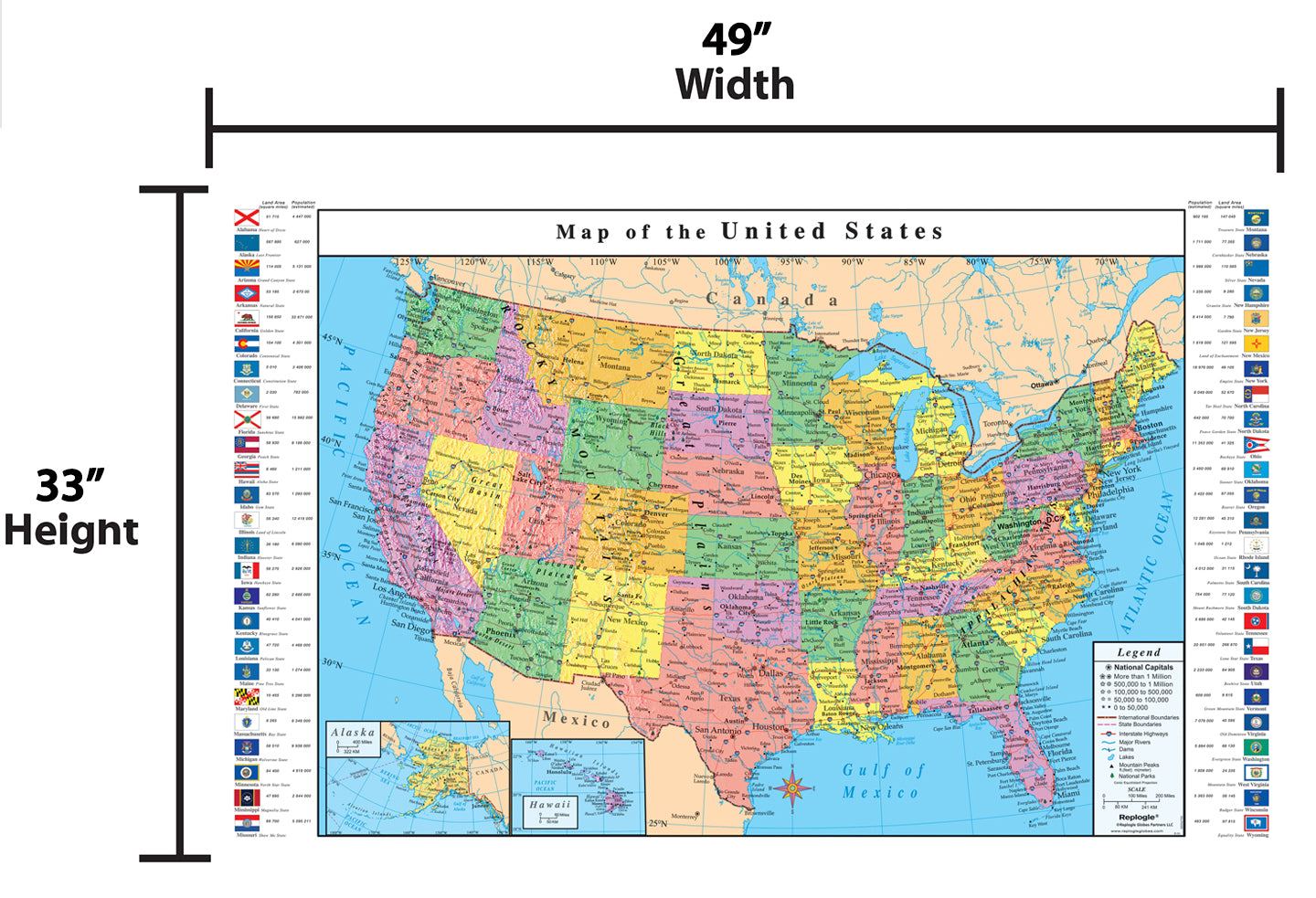 Replogle USA Wall Map with State Flags measures at a size of 49” X 33”.  The USA Wall Maps are beautifully framed by Political colors and Flags of each State.  All colors correspond and match colors on the Replogle educational globes to help reinforce geographic location learning. The Replogle USA map is easy to read and is an essential learning tool for the home and classroom.