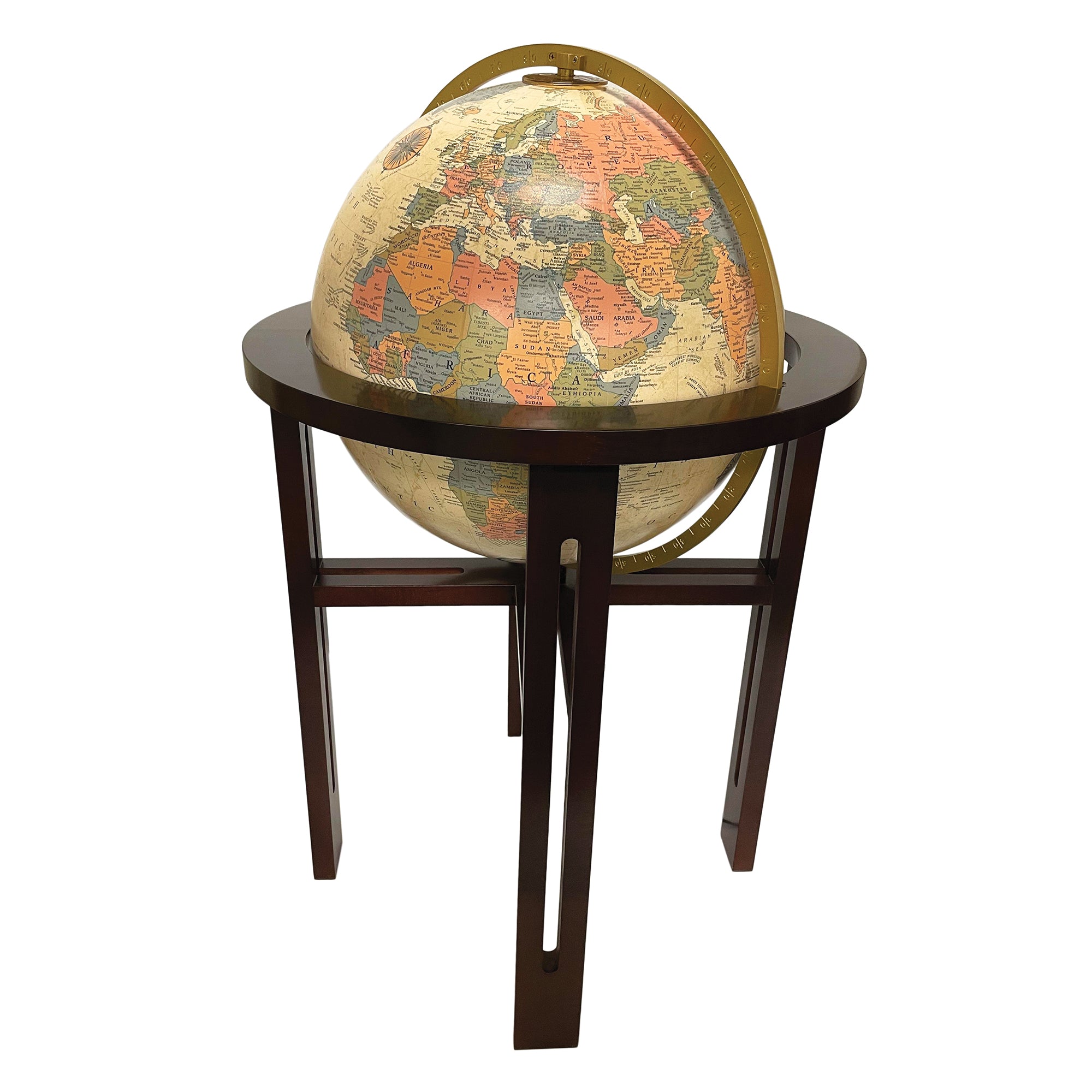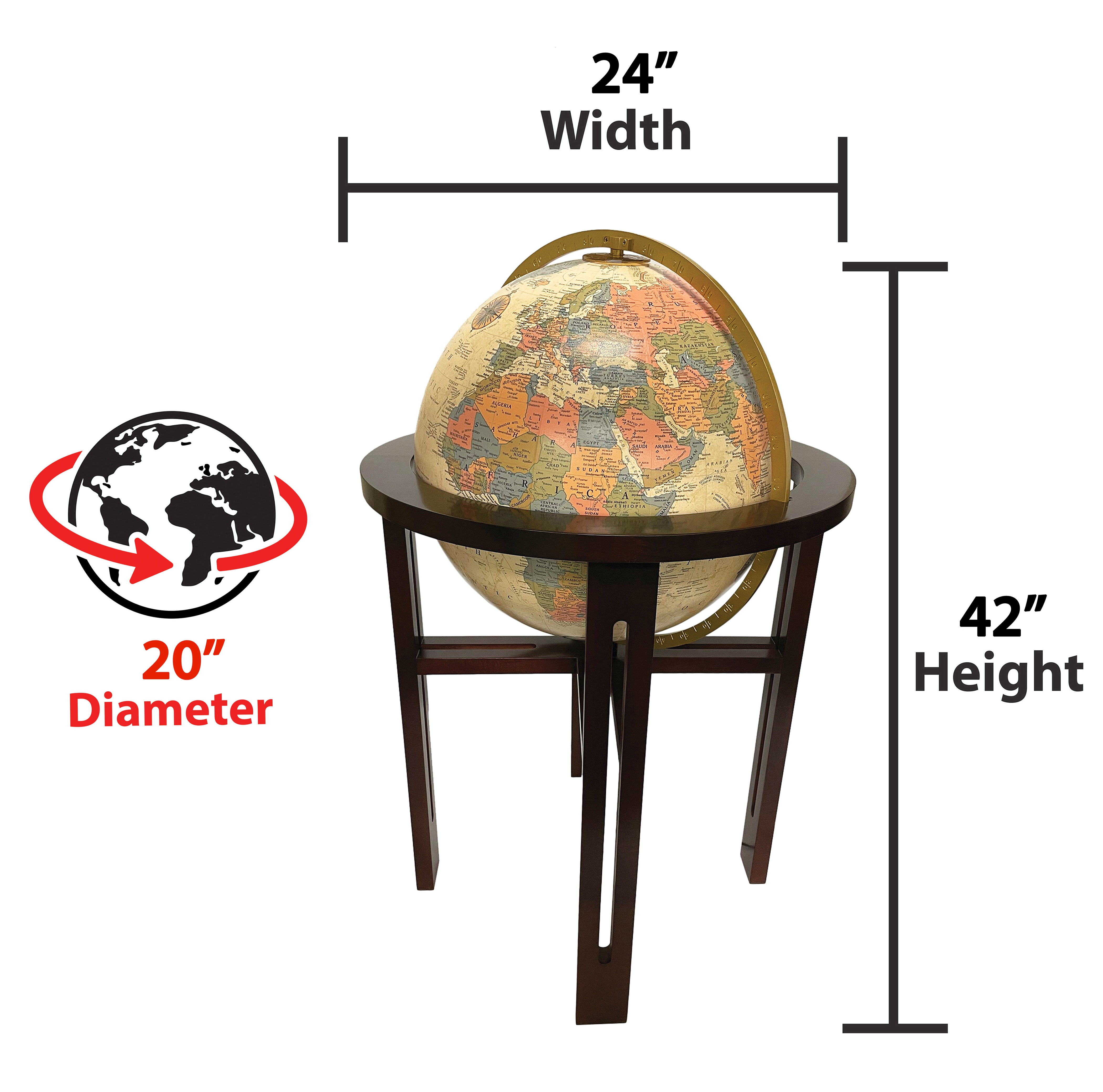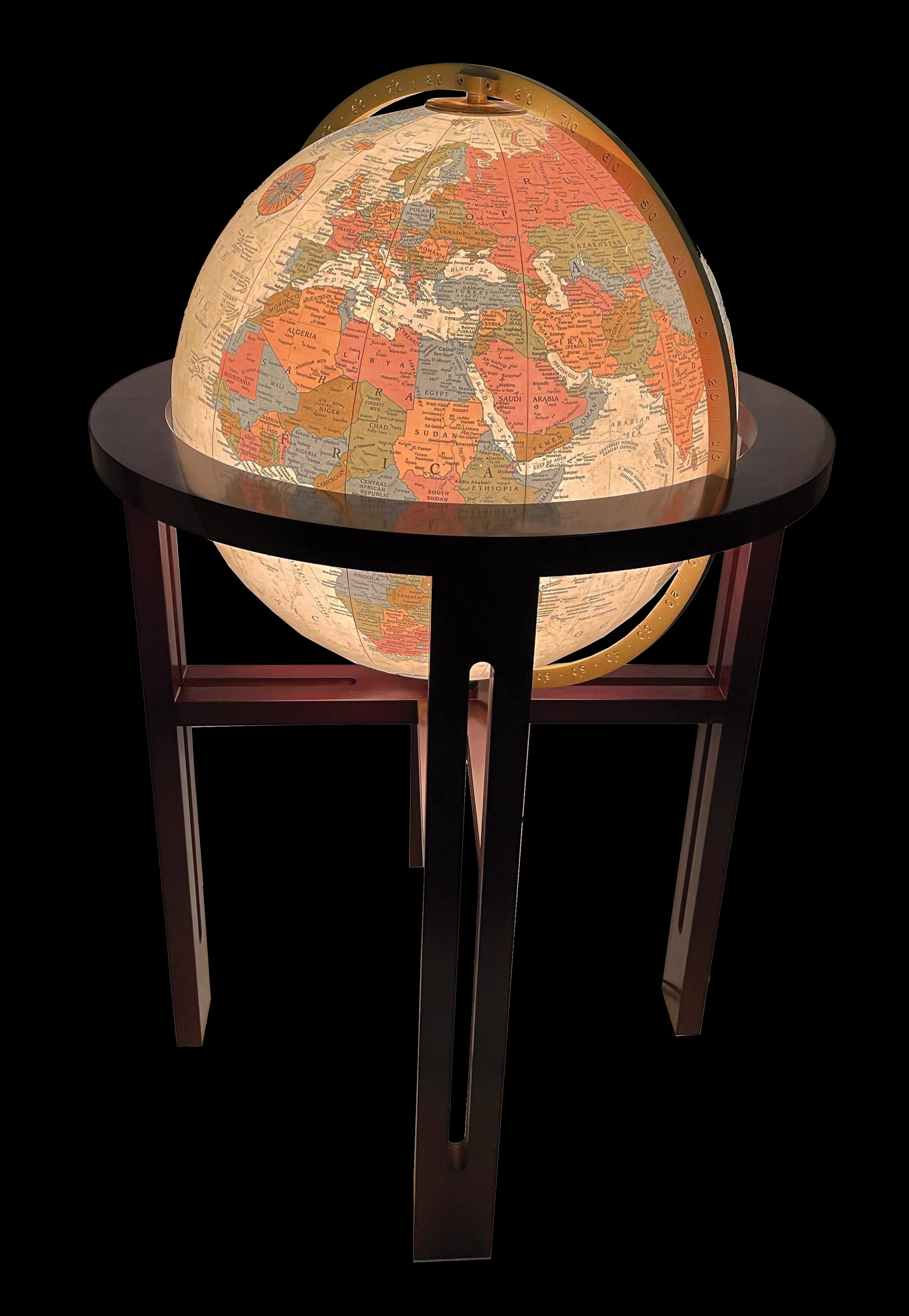 commands attention. This 42”/106 cm tall globe features a walnut stained hardwood stand. This beautiful stand holds a 20”/50 cm diameter hand cut, hand covered globe ball.