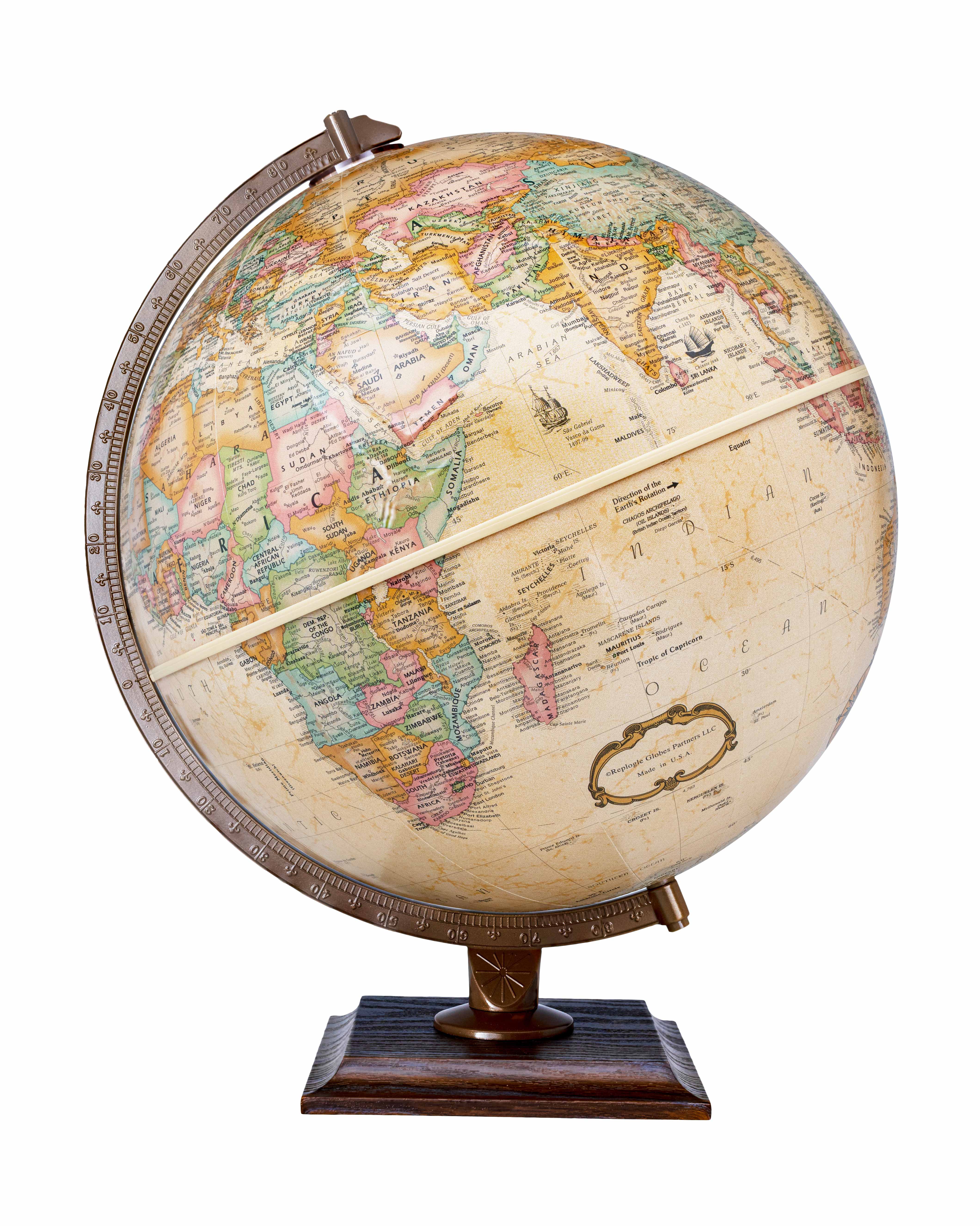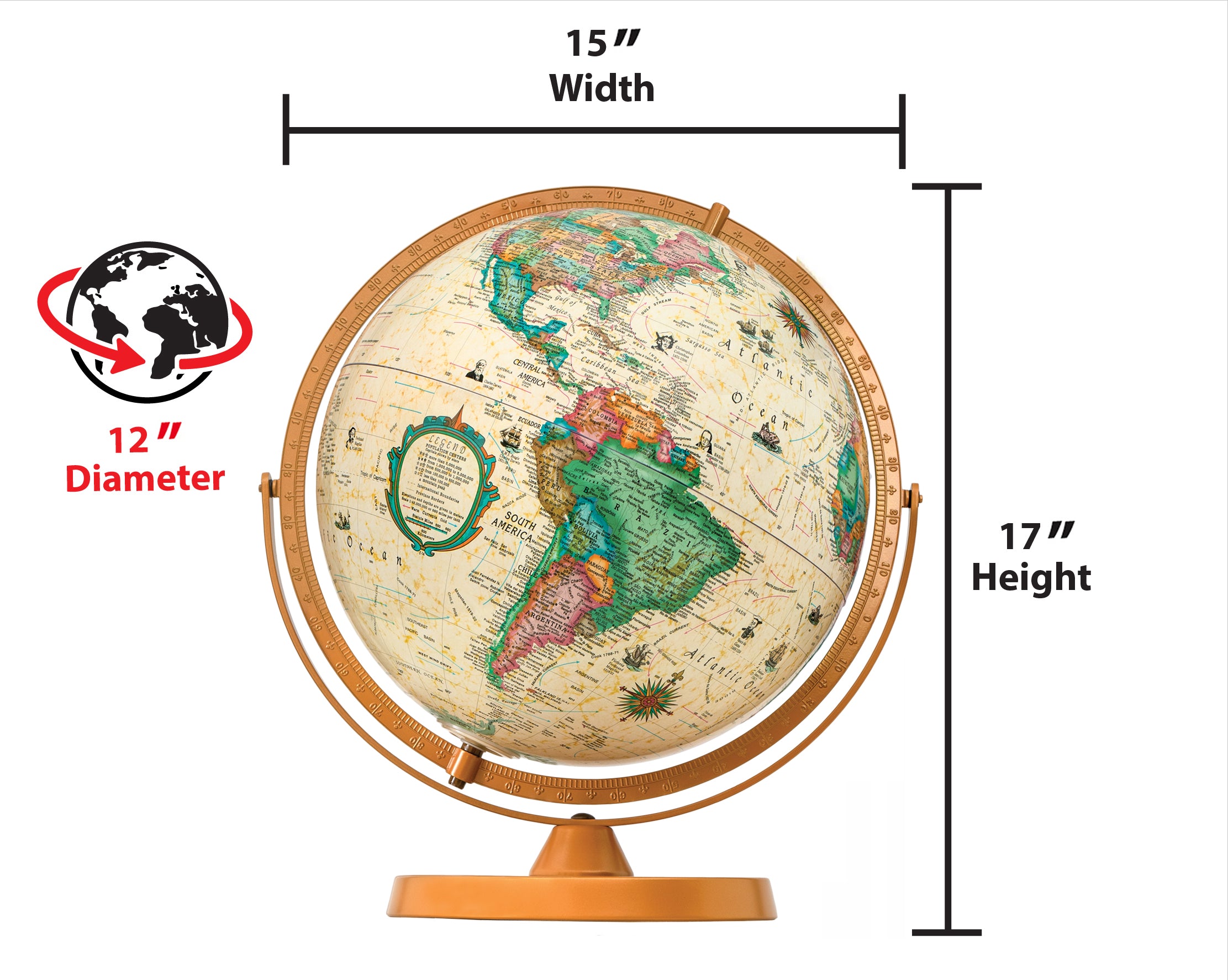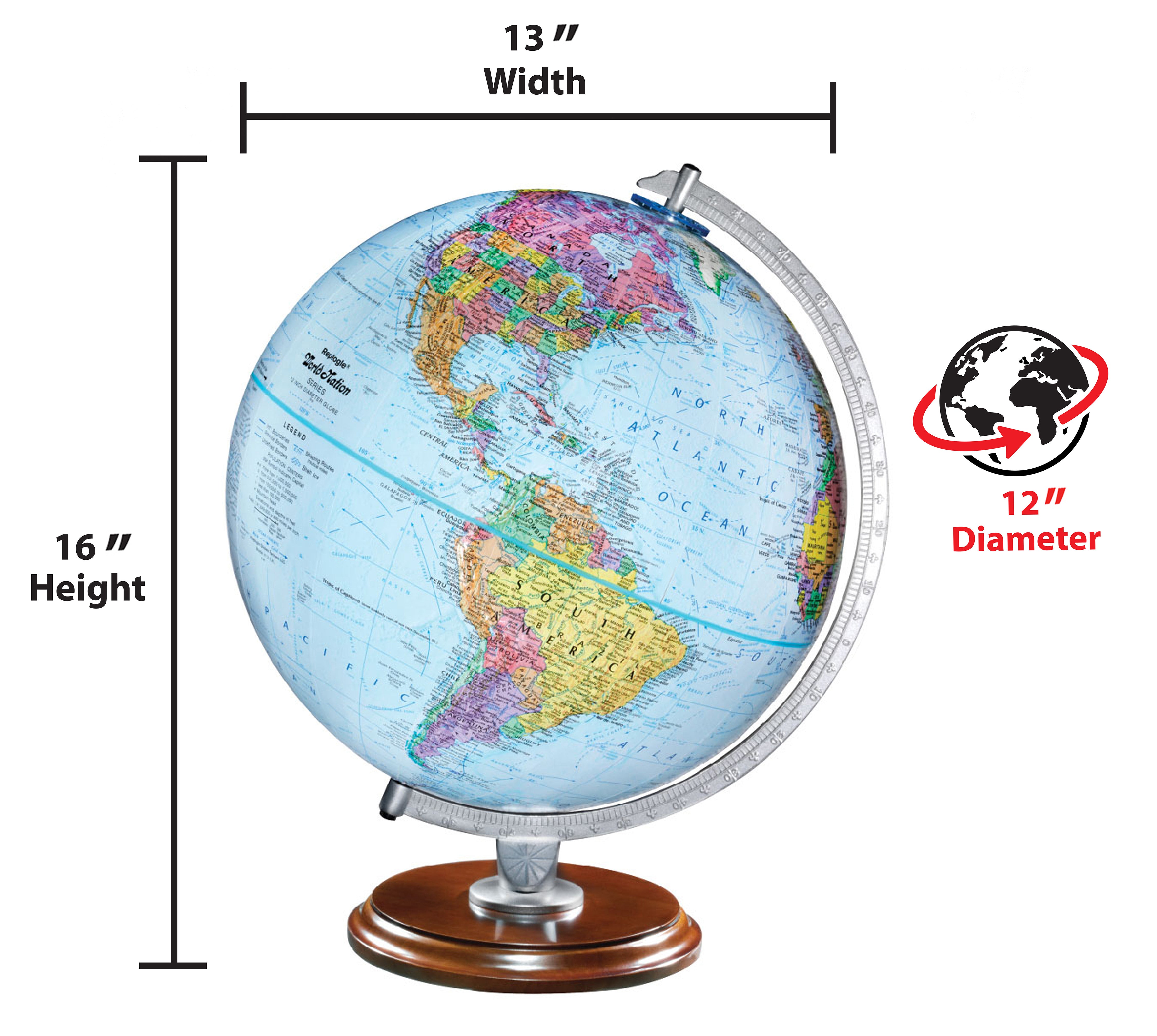 Easy To Assemble World Classis Globe 12" Diameter Antique Ocean Globe with Wood Base and Numbered Semi-Meridian