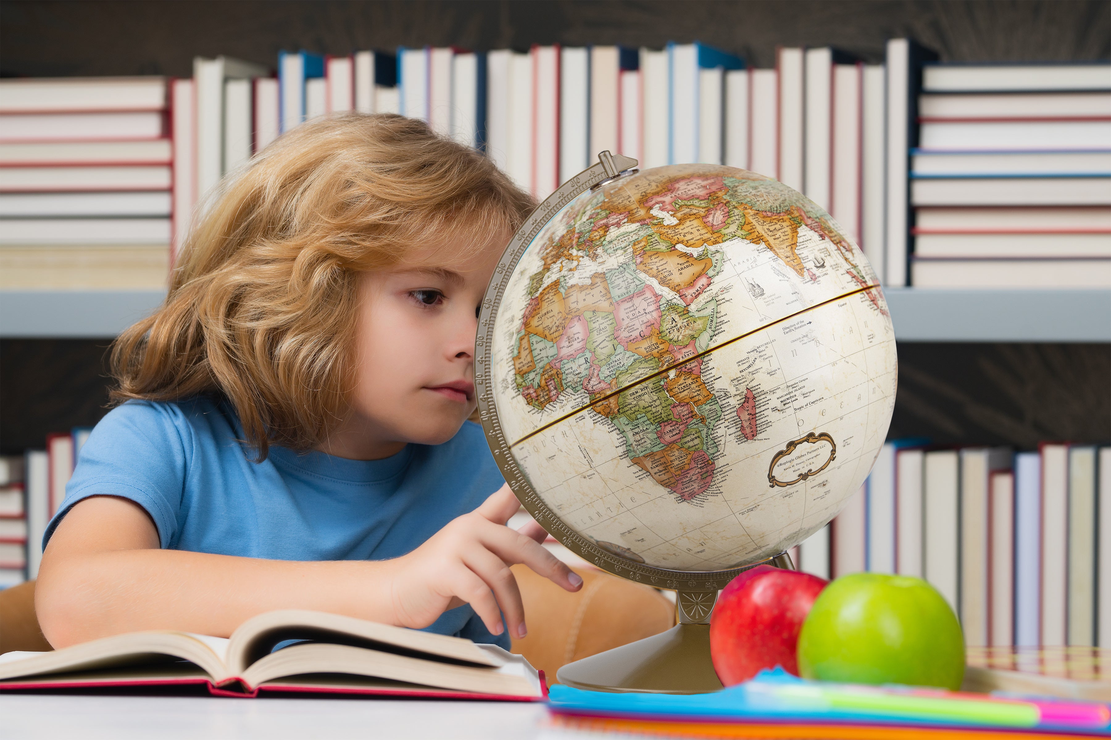 Student Globe 12" Diameter Blue Ocean Globe with Free Two Sided Bonus Map, Sturdy Wood Base and Numbered Semi-Meridian