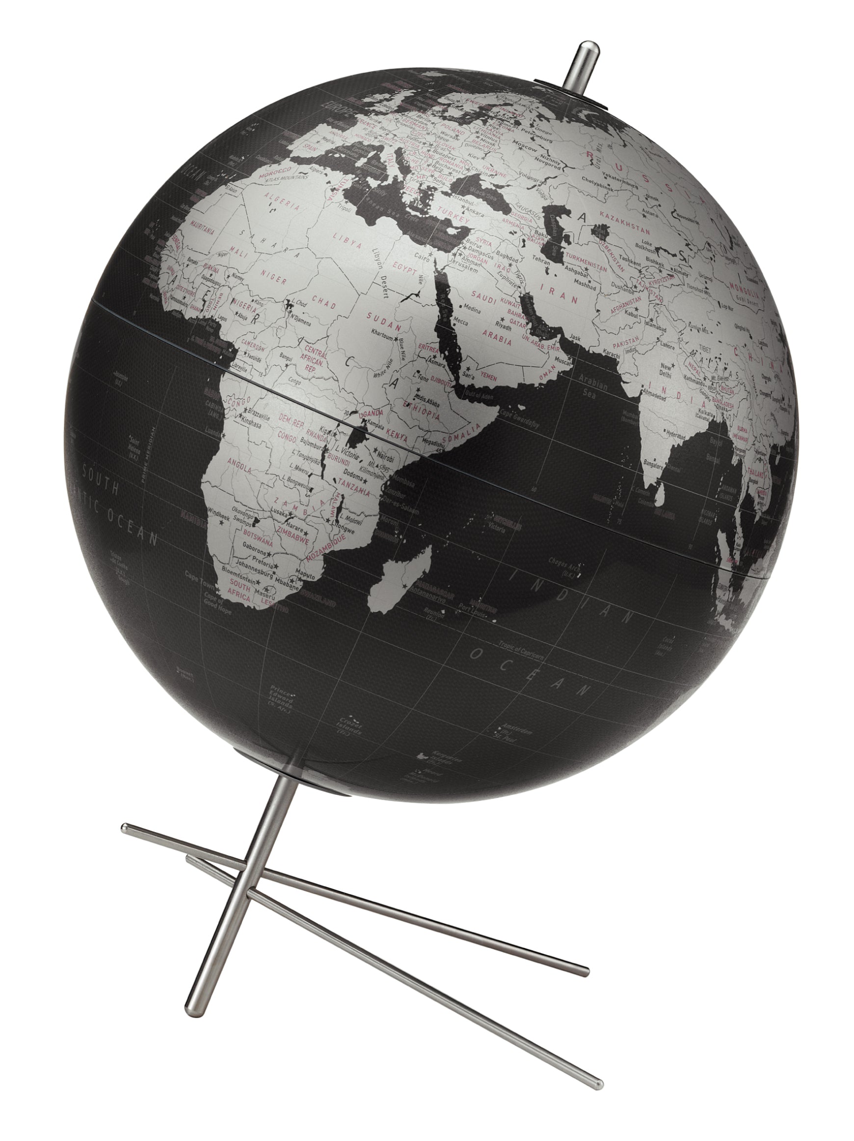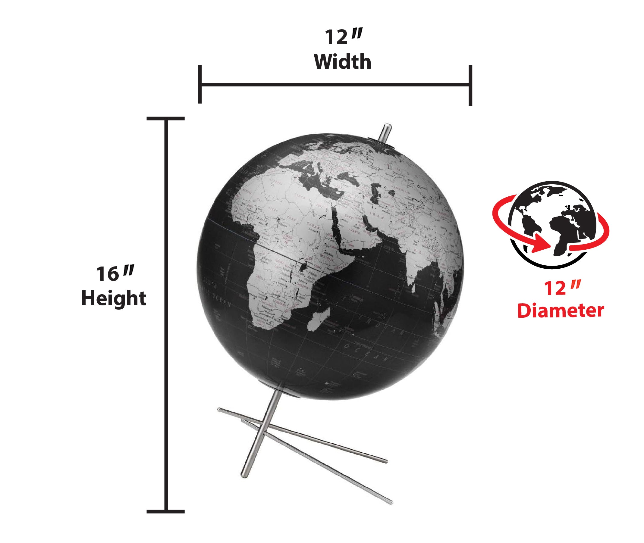 Mikado 12" Diameter Black Ocean Globe with Stainless Steel Base and Inclination Bracket for Unobstructed Viewing