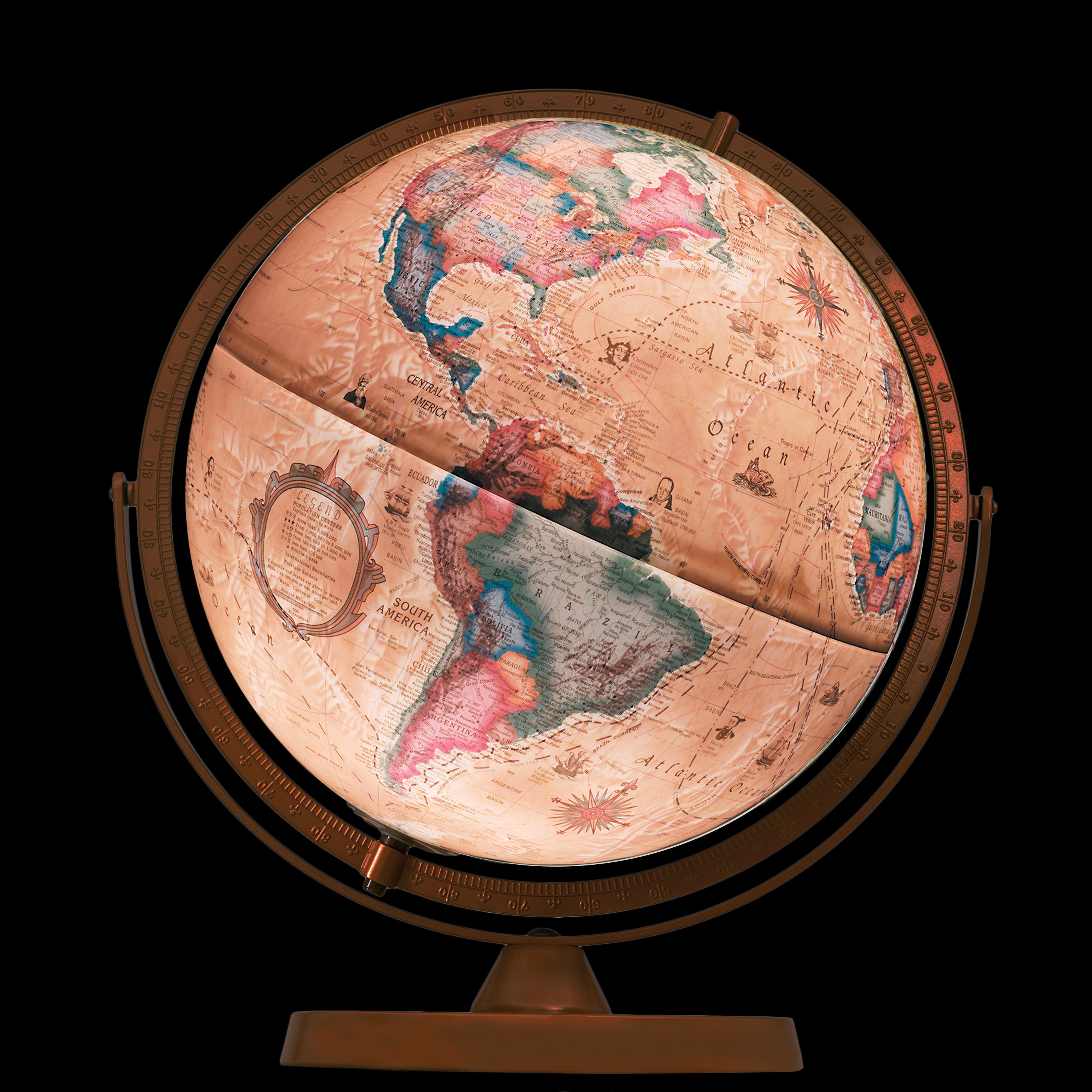 Pioneer Illuminated 12" Diameter Antique Ocean Globe with Metal Base and Full Numbered Meridian