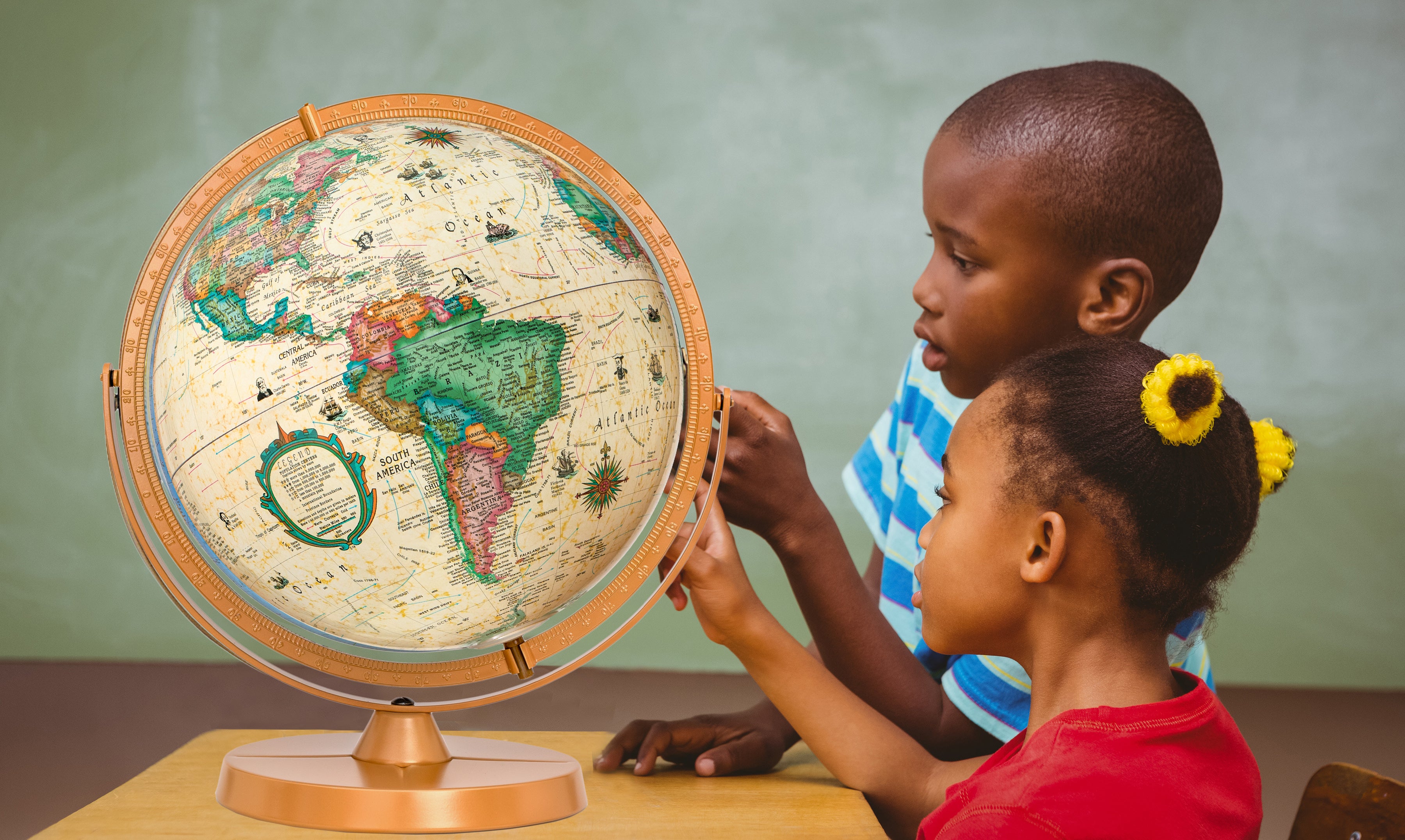 Gulf of America- Franklin 12" Diameter Antique Ocean Globe with Metal Base and Numbered Semi-Meridian