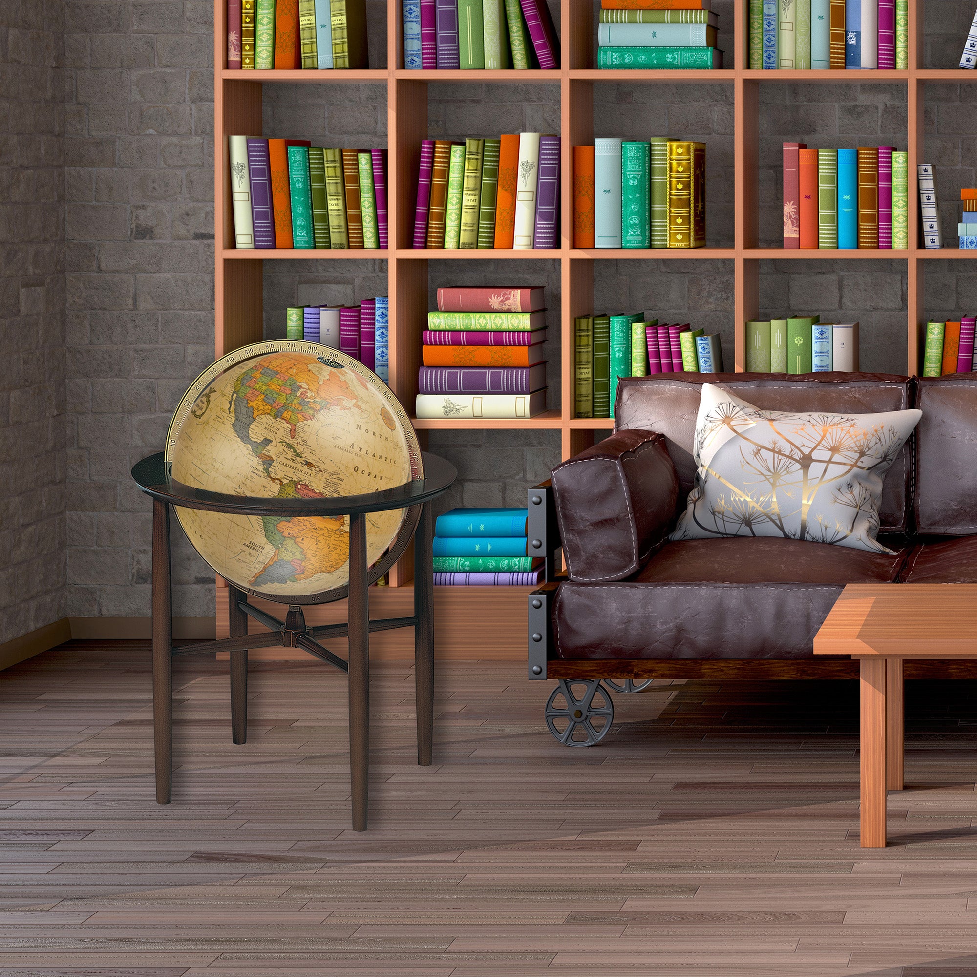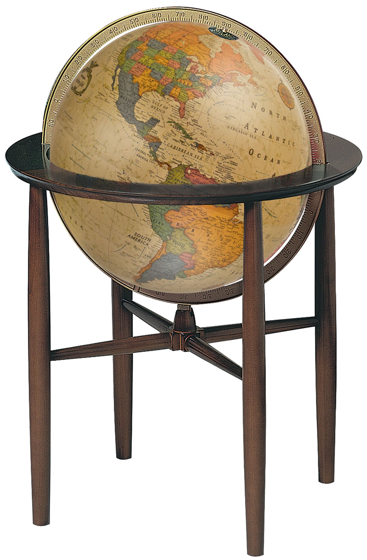 An impressive 16" Antique globe and solid hardwood stand contribute to the exceptional form and function of the Austin. Additional features include an illuminated globe ball and full die-cast numbered meridian. Hand-covered antique globe.