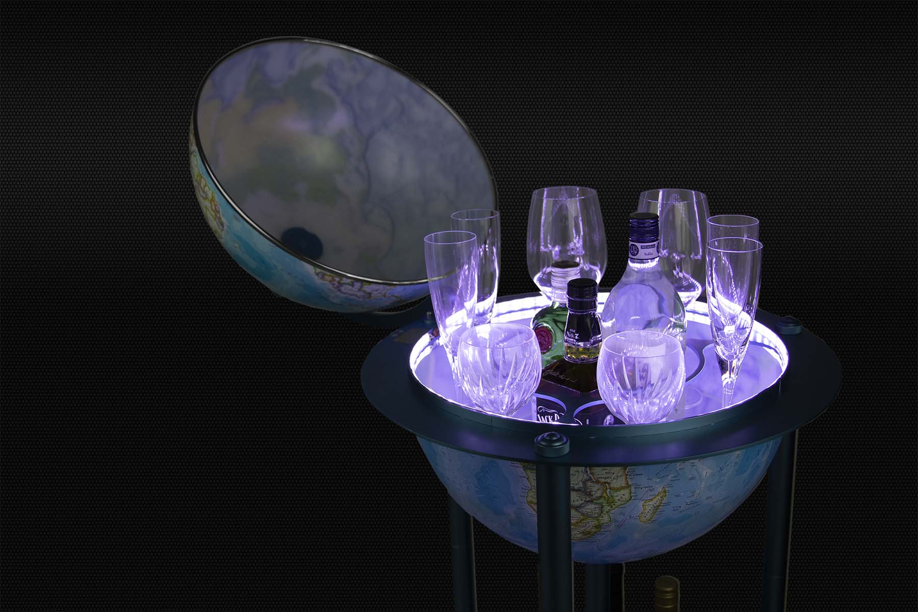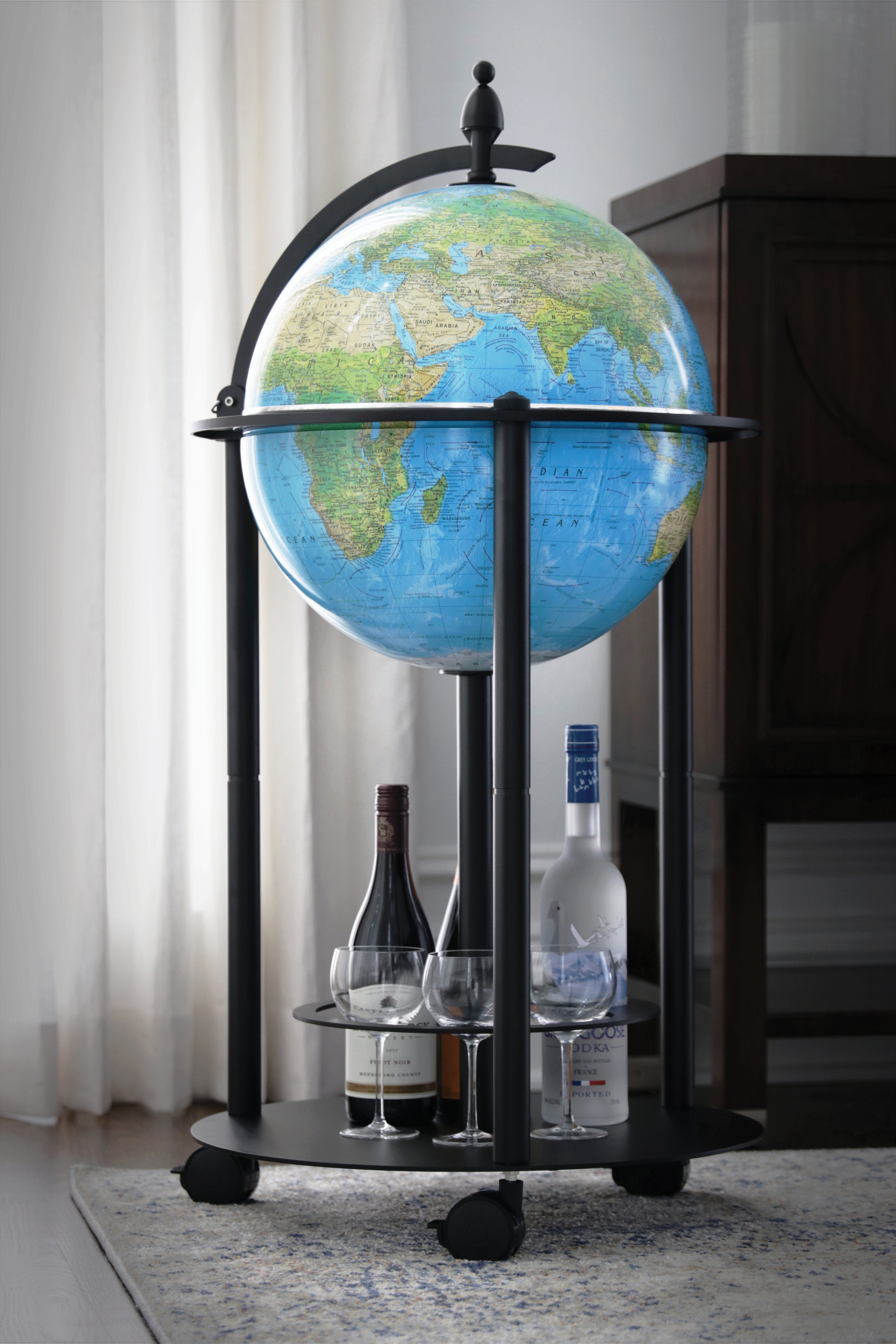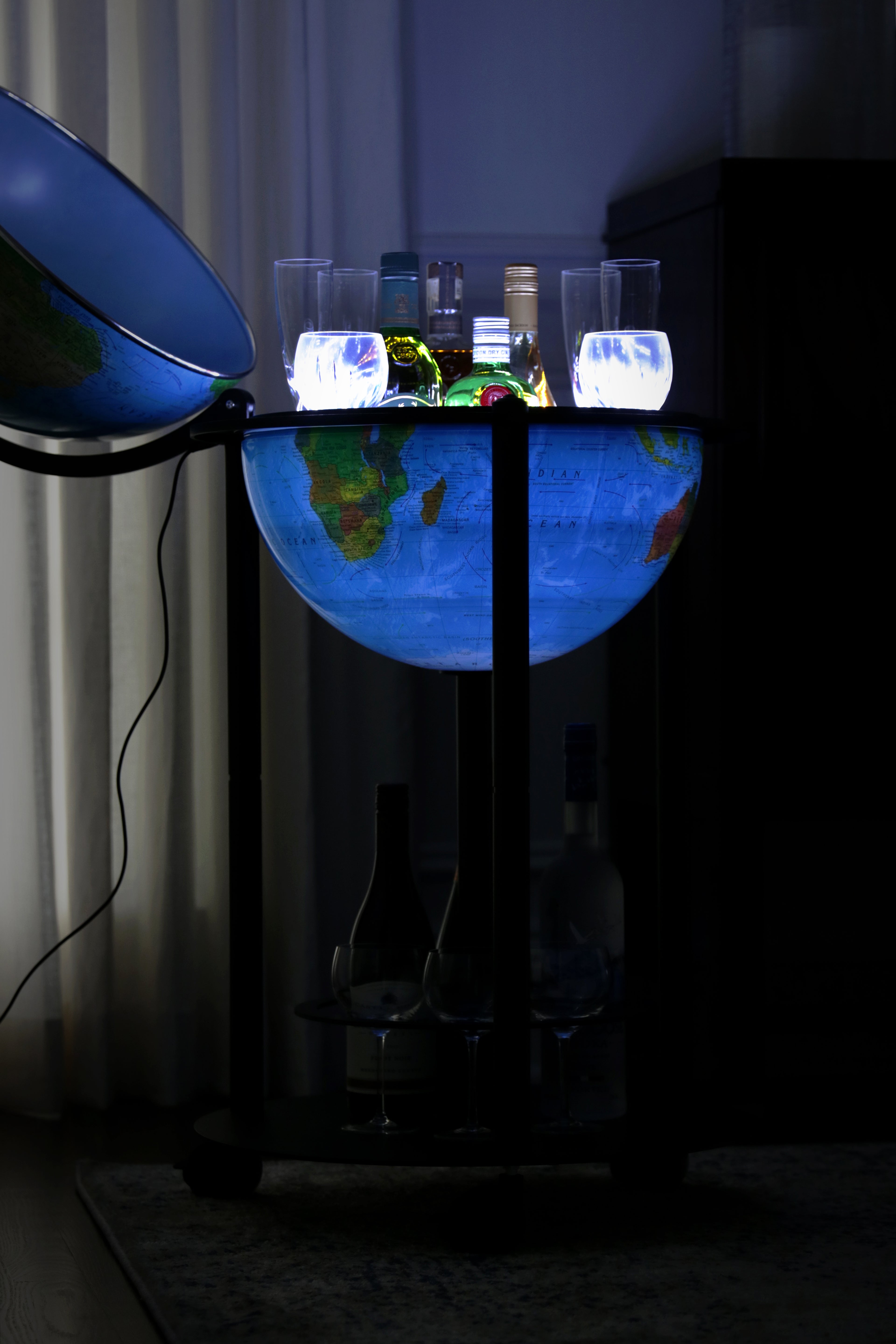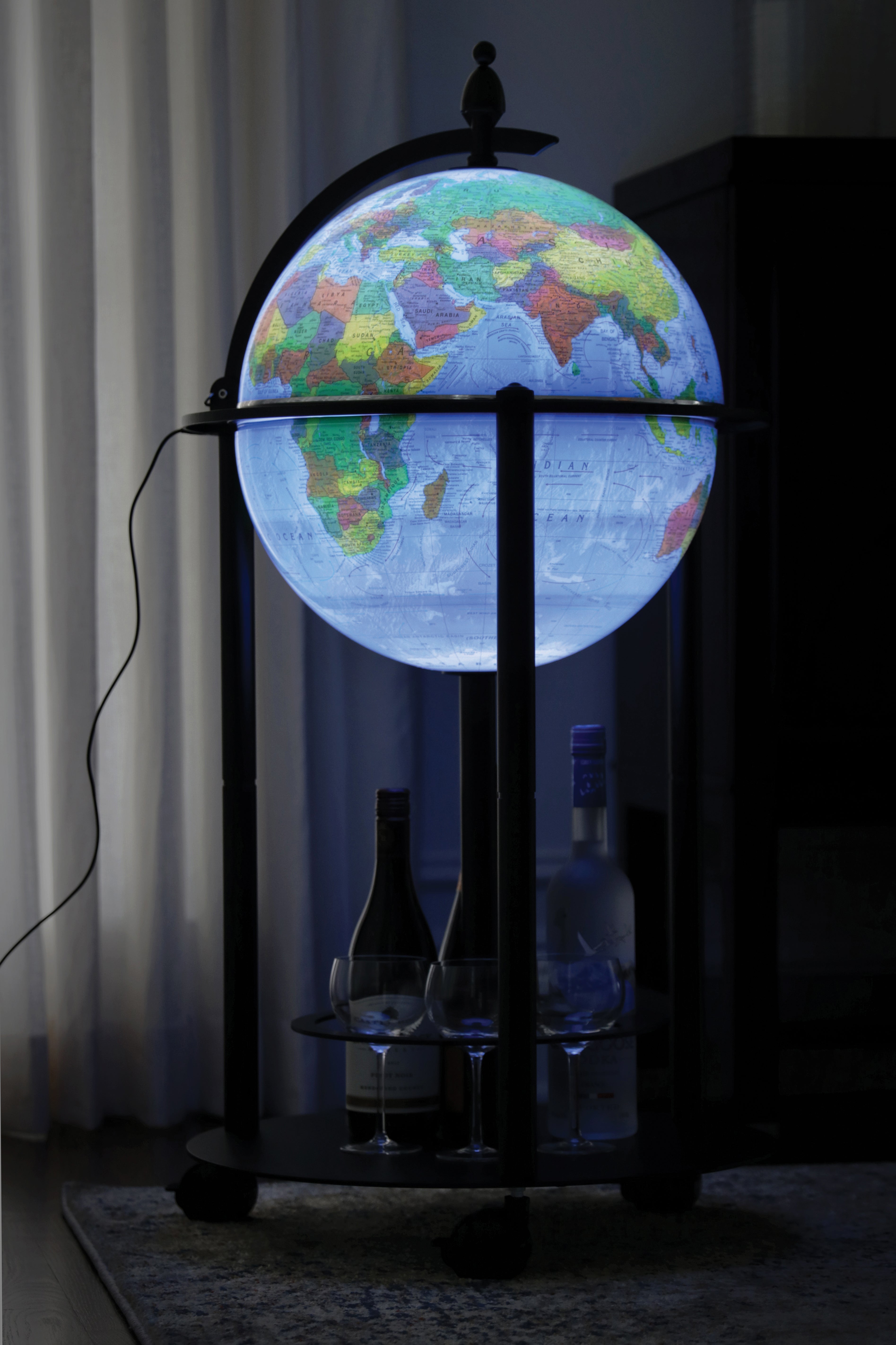 This Illuminated Bar Globe sets itself apart from other bar globes in many ways. It has an up to date topographical map on the outside surface, and once illuminated, it shows an up to date political map on the inside surface. The globe ball also features a 3D raised relief texture that accentuates mountainous terrain. The globe is illuminated by safe and reliable rechargeable LED lights. The stand is a powder coated dark grey color that will go with any décor. When you open the northern hemisphere you will discover a spacious drink cabinet which allows you to store a diverse number of spirit bottles and glasses. The base, made of sturdy metal, is also designed to accommodate additional storage of glasses and bottles. In addition, clean-up is easy with any spills due to the material of the globe ball. This unique bar globe has a protection feature which includes a sturdy combination lock that can be used to secure select spirits or crystal drink ware. The stand's casters have a locking mechanism to ensure that the globe will not inadvertently roll and will stay in place. This globe is a perfect decor piece for your home and/or e. This globe can also be personalized for that special someone for a small additional charge.