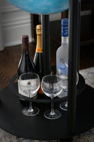 - Sturdy metal stand has bottom shelf with an additional storage for glasses and bottles