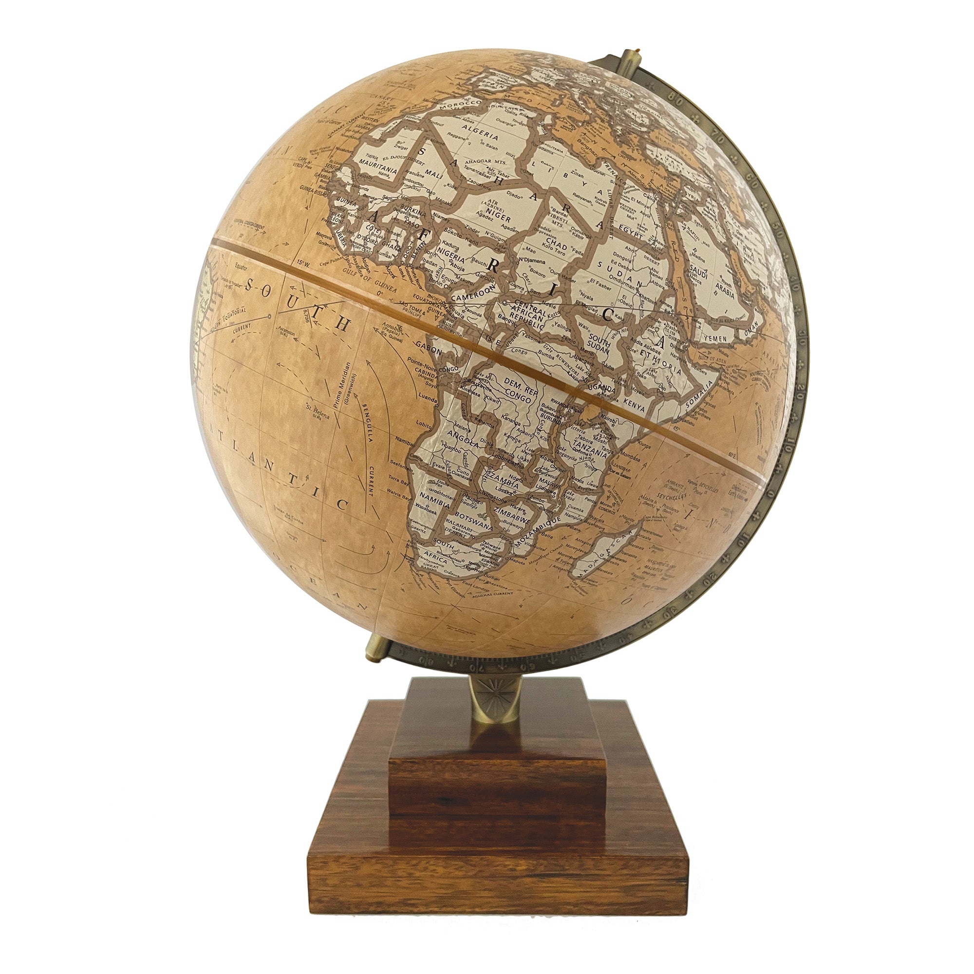 The 12 inch diameter Santiago Designer Globe combines the stylings of a classic parchment antique ocean globe with clean white land masses. The up to date cartography features dark brown border outlines and three dimensional raised relief that highlights the major mountain ranges of the world. This striking globe ball is held by a calibrated die-cast semi-meridian and is mounted on a solid, classically designed two tiered walnut color wood base. The Santiago's superior design will ensure that this beautiful globe will be the centerpiece of any room for generations.