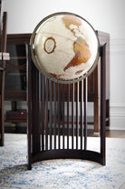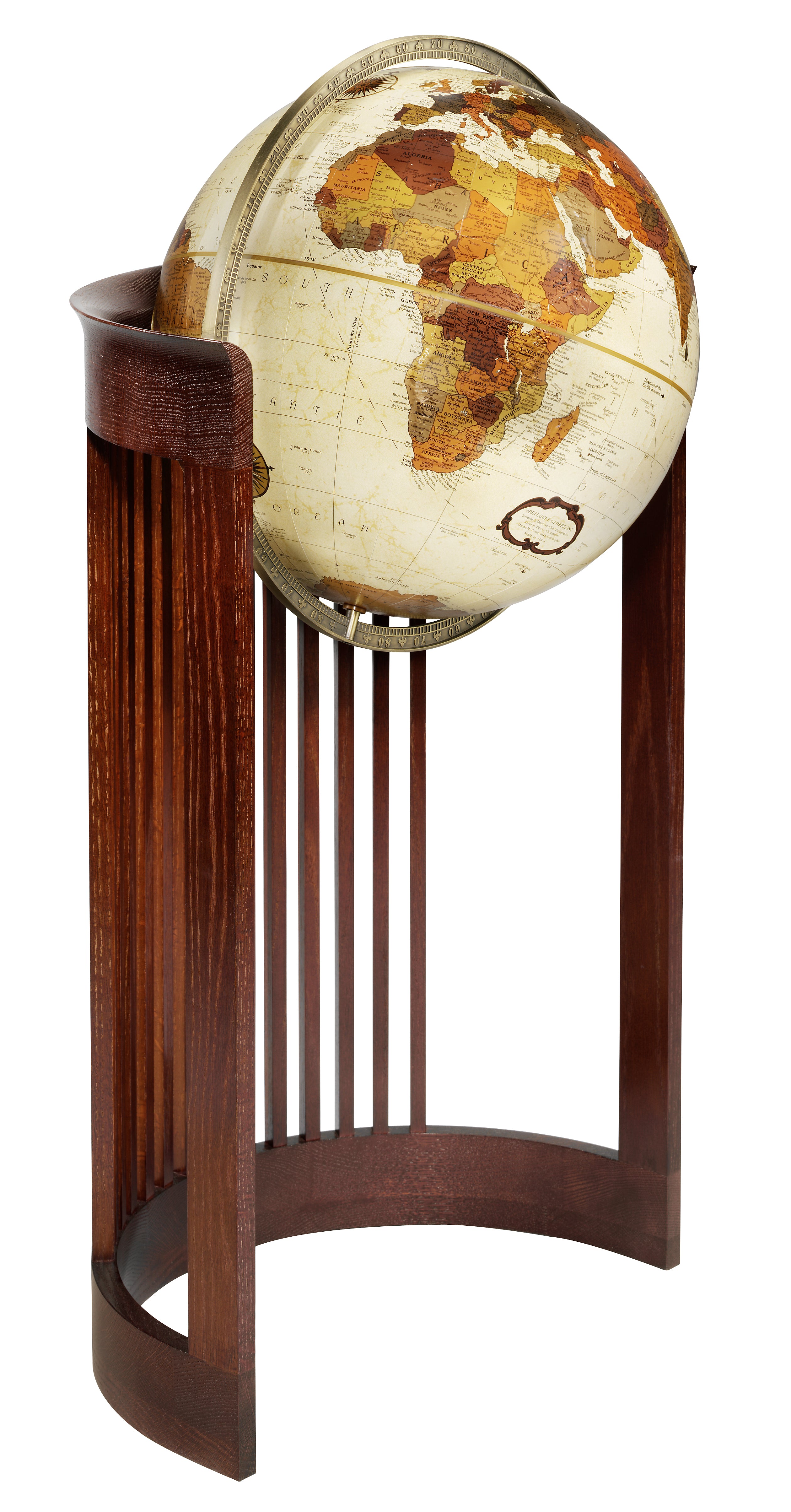 This globe stand is an adaptation of one of the most universally recognized furniture designs found in the Frank Lloyd Wright Foundation archives. It is a modified version of the famous “Barrel Chair” originally designed by Frank Lloyd Wright in or his personal use at “Taliesin” in Spring Green, WI and for Herbert F. Johnson for his home “Wingspread” in Racine, WI in 1937. The Barrel Chair Floor Globe features a 16”/40cm diameter bronze metallic raised-relief globe with beautifully blended earth-tone colors. The Barrel’s solid hardwood stand is hand crafted in Replogle’s workshop by Replogle’s master woodworker, Henry Krasuski.