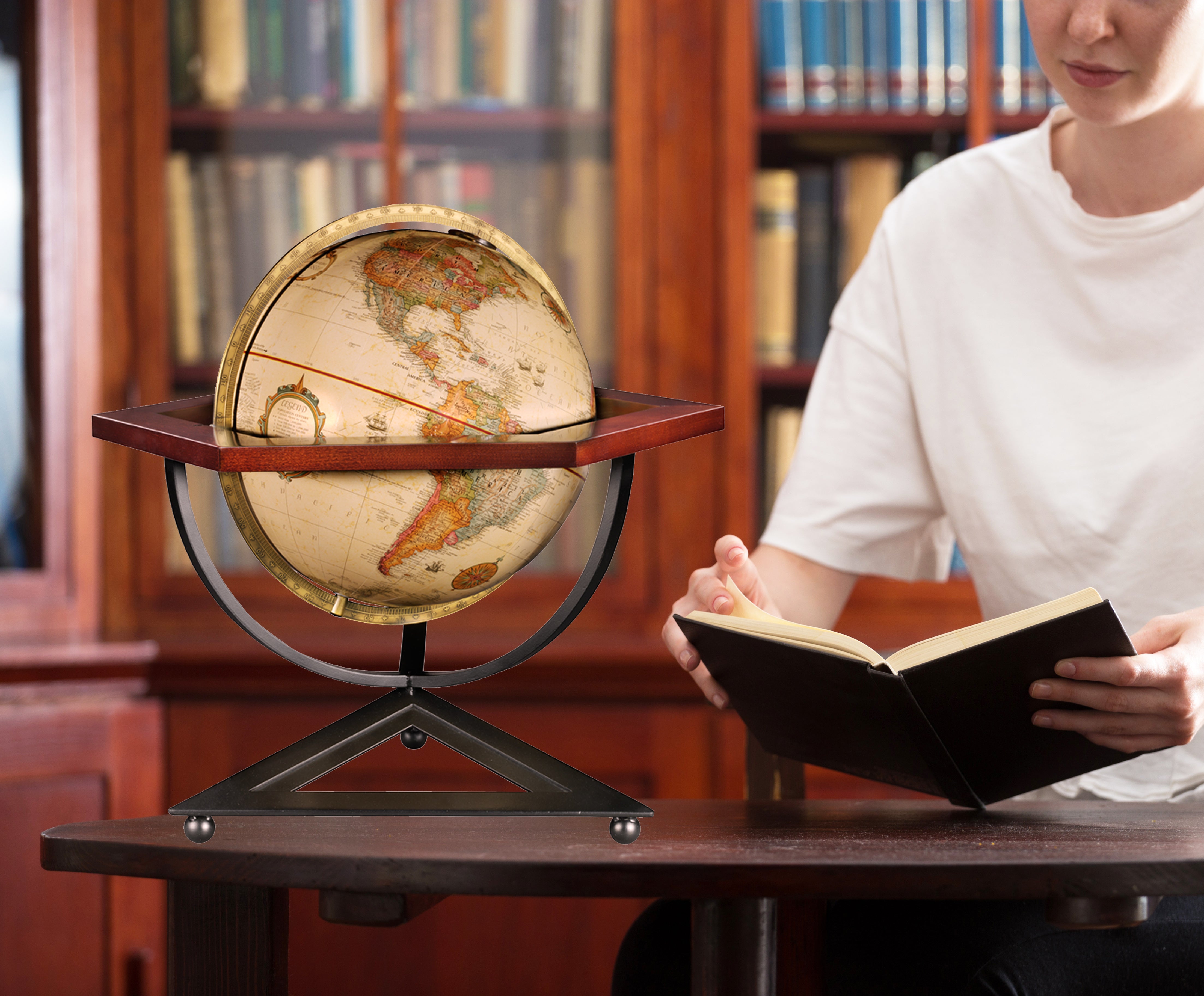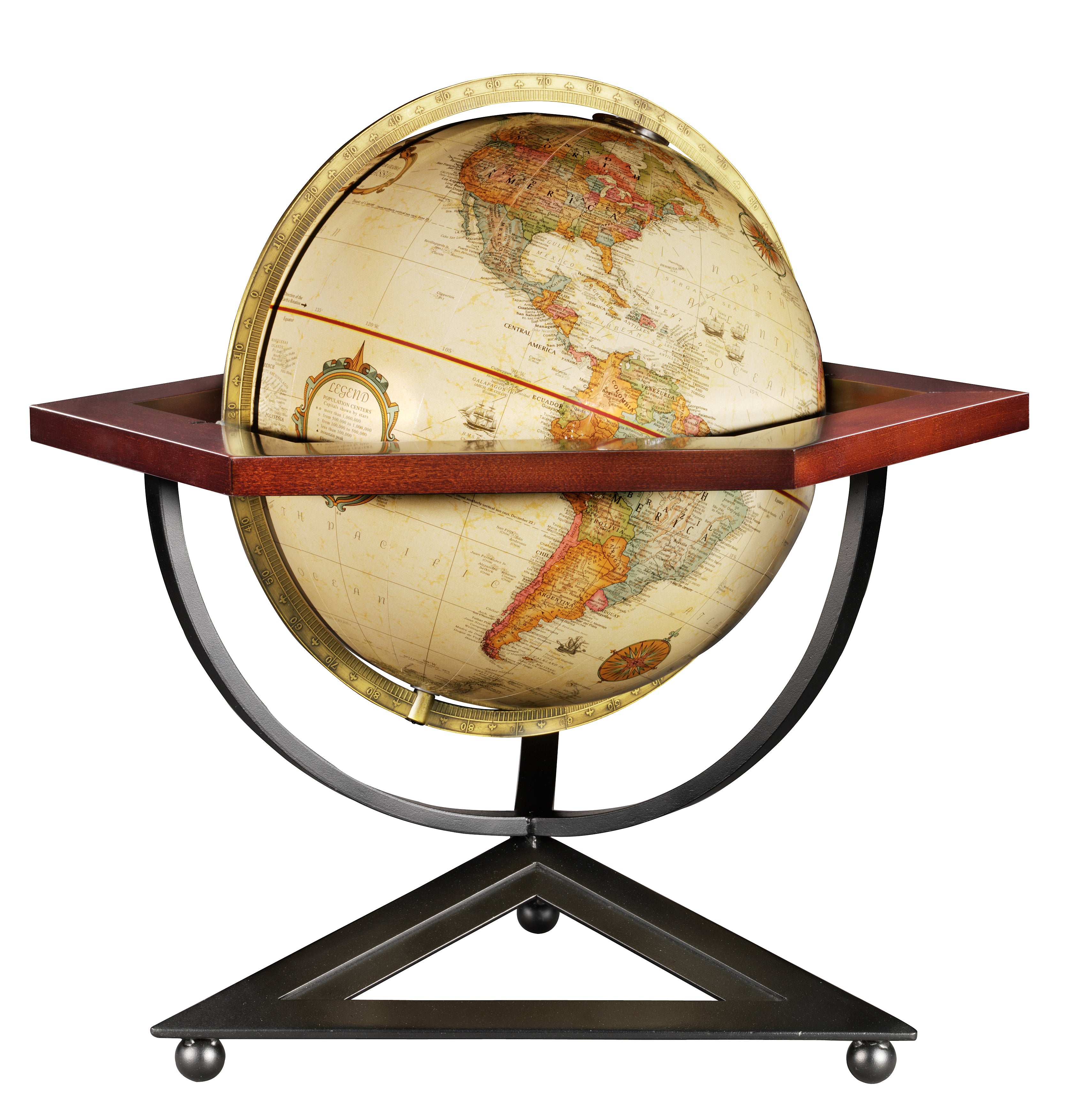 Frank Lloyd Wright’s overall concept for his buildings included the integration of the interior furnishings. In 1952, he developed a series of hexagonal metal chairs, tables and other furniture for the H. C. Price Tower in Bartlesville, OK that coordinated with the geometric shape of the building. Adapted from the hexagonal hassock design, this globe stand exemplifies the three Organic Elements used by Wright throughout his lifetime. The metal base is triangular, the wood globe support is hexagonal, and the globe is circular.