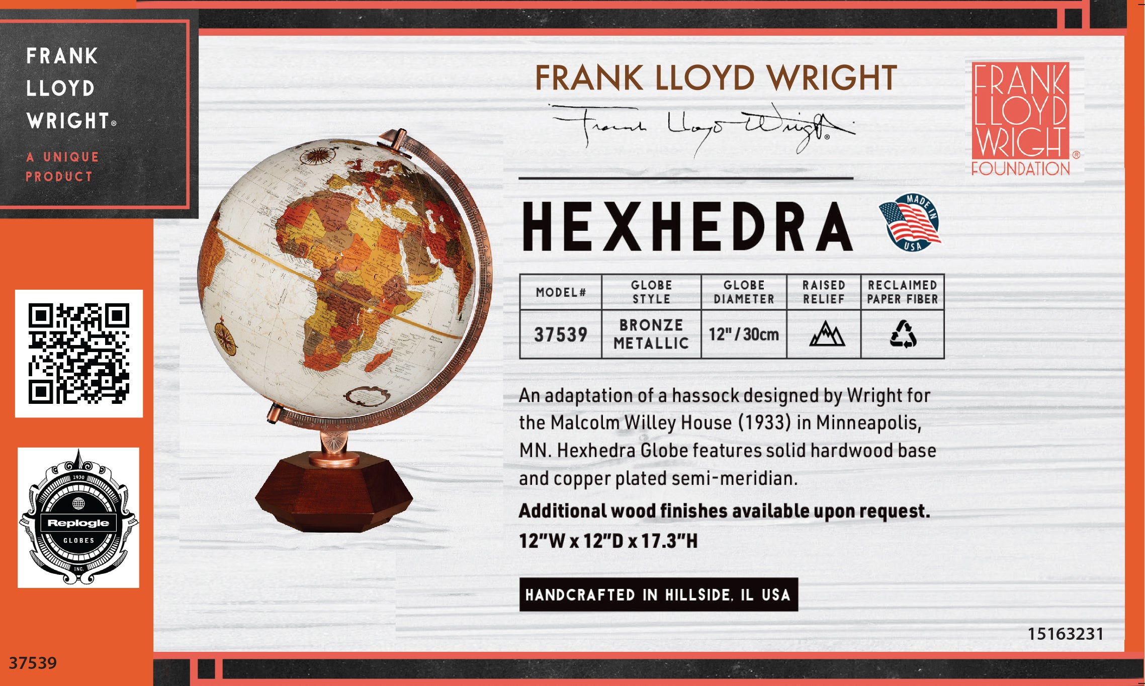 An adaptation of a hassock designed by Wright for the Malcolm Willey House (1933) in Minneapolis, MN. Hexhedra Globe features solid hardwood base and copper plated semi-meridian.