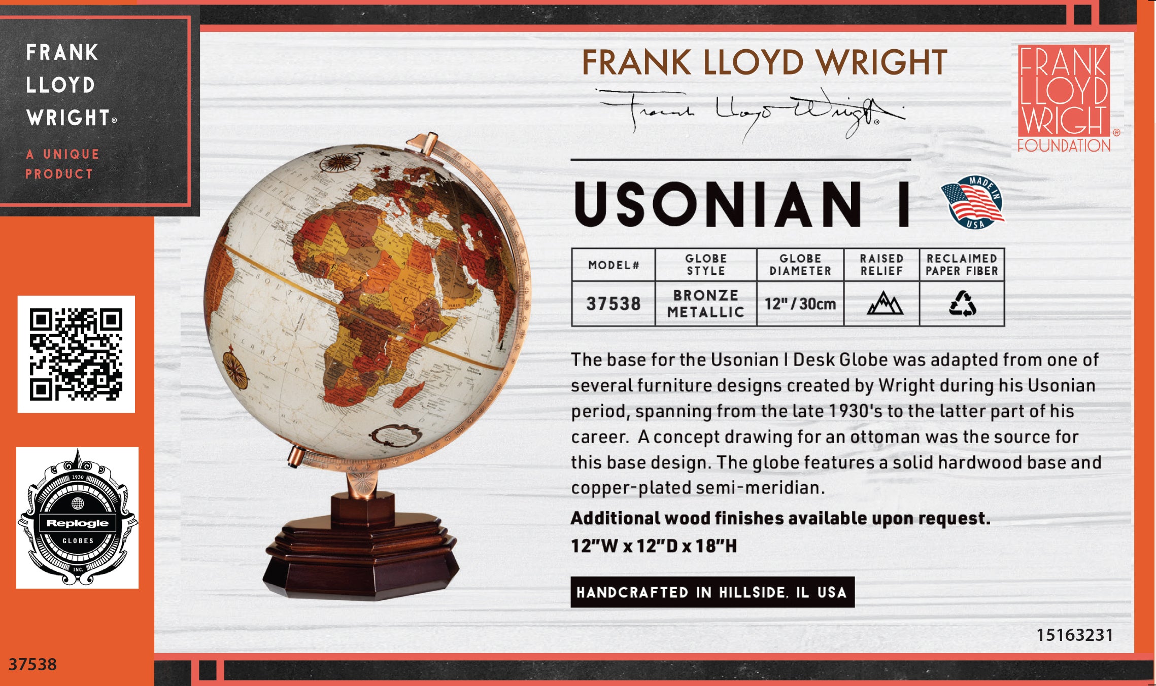 The base for the Usonian I Desk Globe was adapted from one of several furniture designs created by Wright during his Usonian period, spanning from the late 1930's to the latter part of his career. A concept drawing for an ottoman was the source for this base design. The globe features a solid hardwood base and copper-plated semi-meridian.