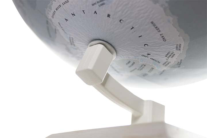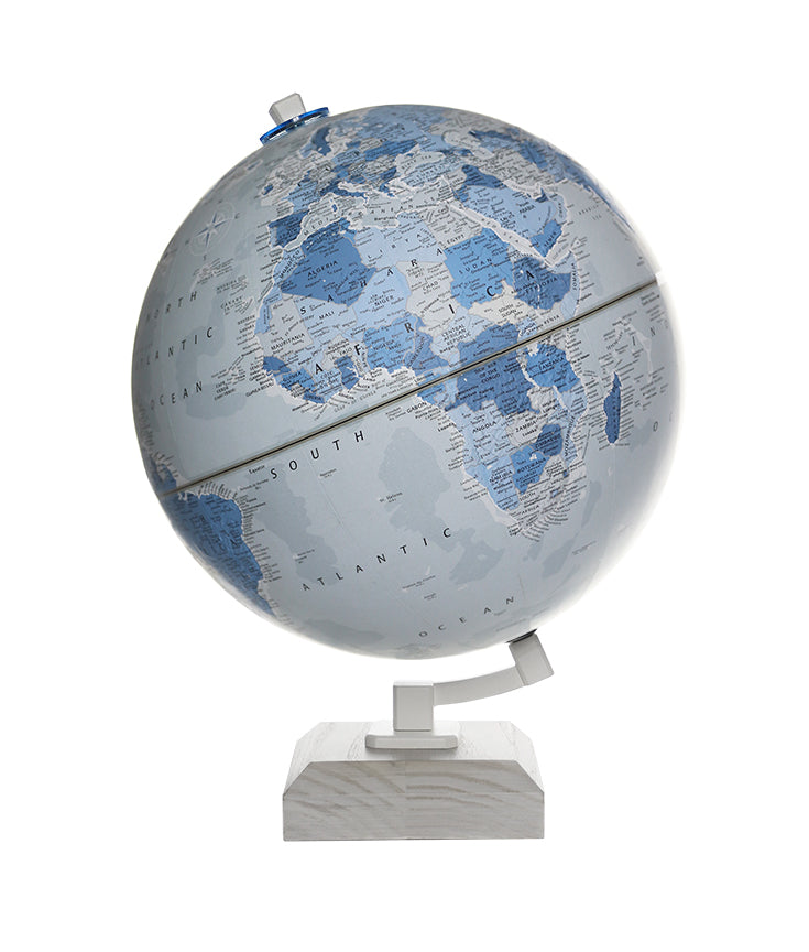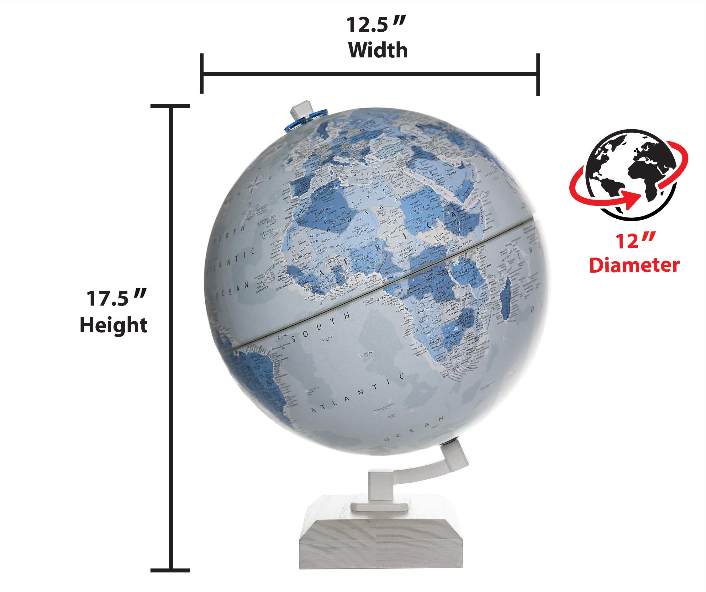 Berkner 12" Diameter Globe, USA Cartography with Mountain Relief, Solid Wood Base and Special Blue Designer Globe Ball. The Berkner is an extraordinary globe with an up-to-date political map and a gorgeous two-tone color palette that offers both style and function. Let your fingertips do the walking and explore over 3,000 place names and feel the raised relief on the surface of this globe. This globe also features a unique “raised relief” embossing that provides a 3D-like texture to various terrains. The globe ball is complemented by a uniquely styled white wood base made from solid ash and matching inclination bracket.