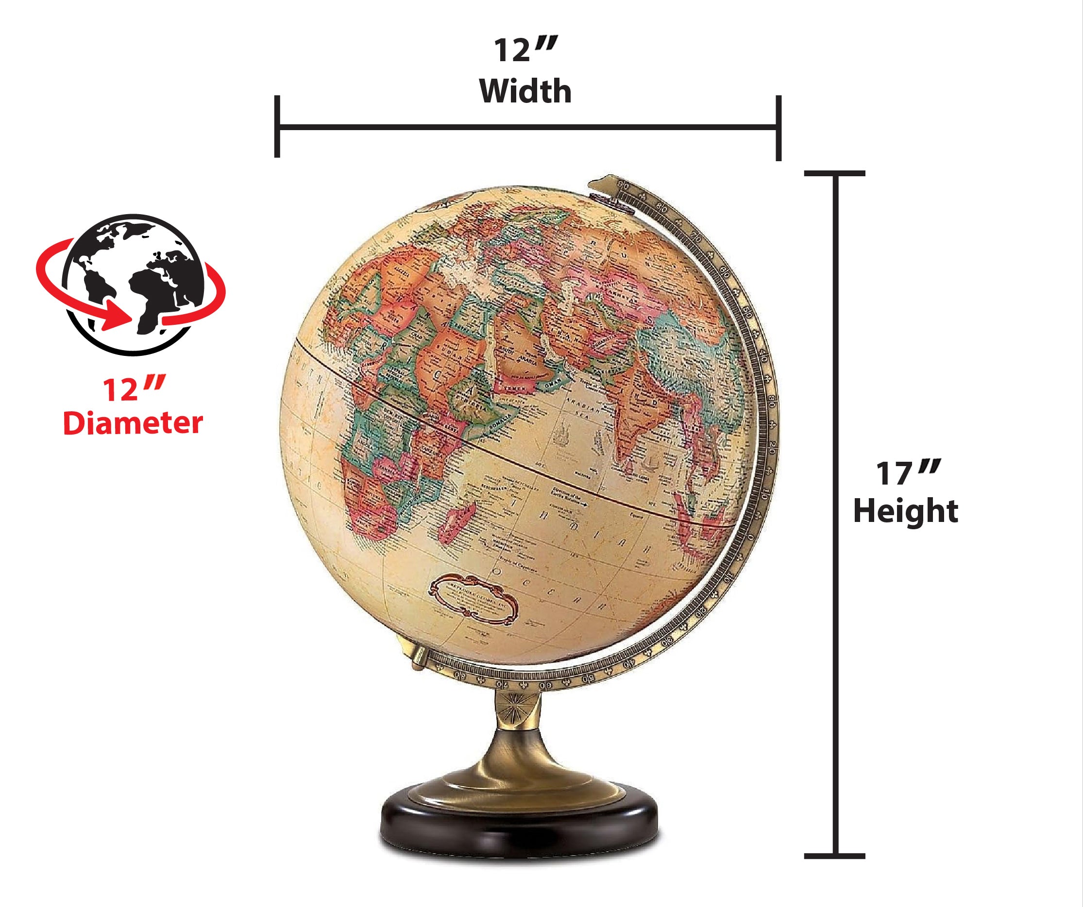 - 12-inch diameter world globe ideal for desktops