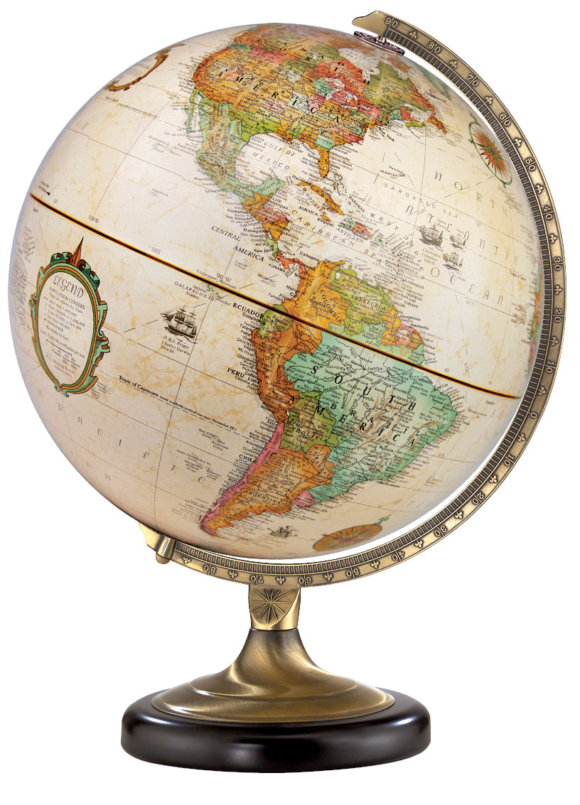 Sierra 12" Diameter Globe, USA Cartography with Raised Mountain Relief and Sturdy Metal Base. Explore the true perspective of the world. An antique brass and black metal base is the foundation upon which the Sierra globe is built. This 12”/30 cm antique-ocean desktop globe features a calibrated semi-meridian.
