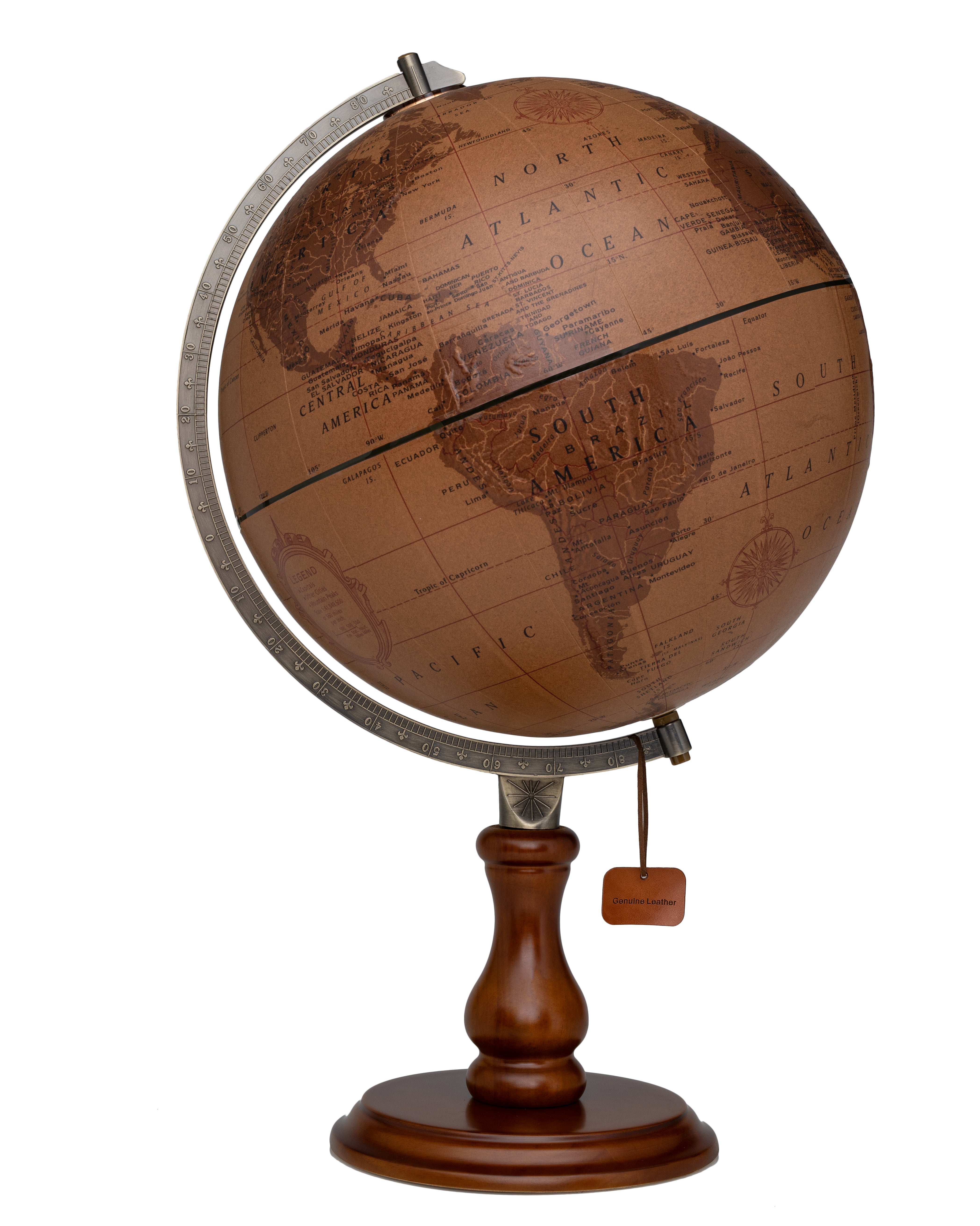 Leather Expedition 12" Diameter Globe, USA Cartography with Genuine Leather Globe and Stolid Wood Base and Riser. Transport yourself to the far corners of the world. This exclusive desktop accessory offers a genuine leather 12”/30 cm globe with an antique brass-plated, die-cast semi-meridian, mounted on an elegantly crafted hardwood base and riser with dark walnut finish. A unique take on the globe and a perfect gift.