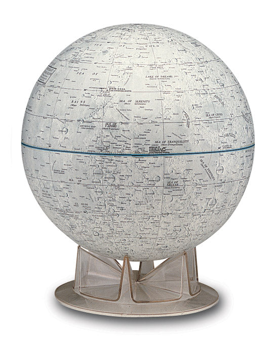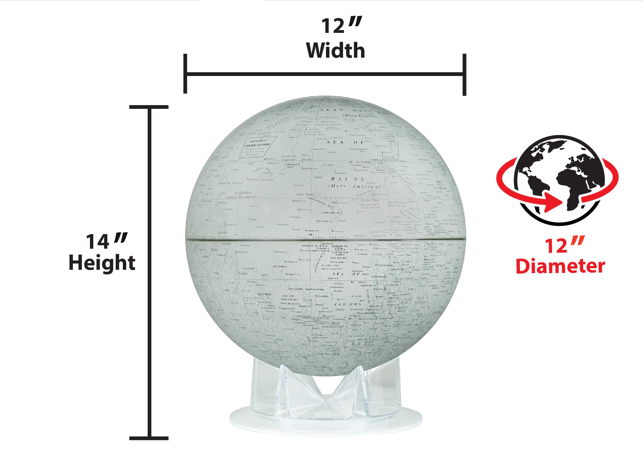 12" Diameter Moon Globe, NASA Approved  with over 3000 Place Names and a Free Mount Acrylic Base. This extraordinary 12” diameter globe accurately depicts the geographical features of the Earth’s  moon, including craters, seas and mountain ranges.