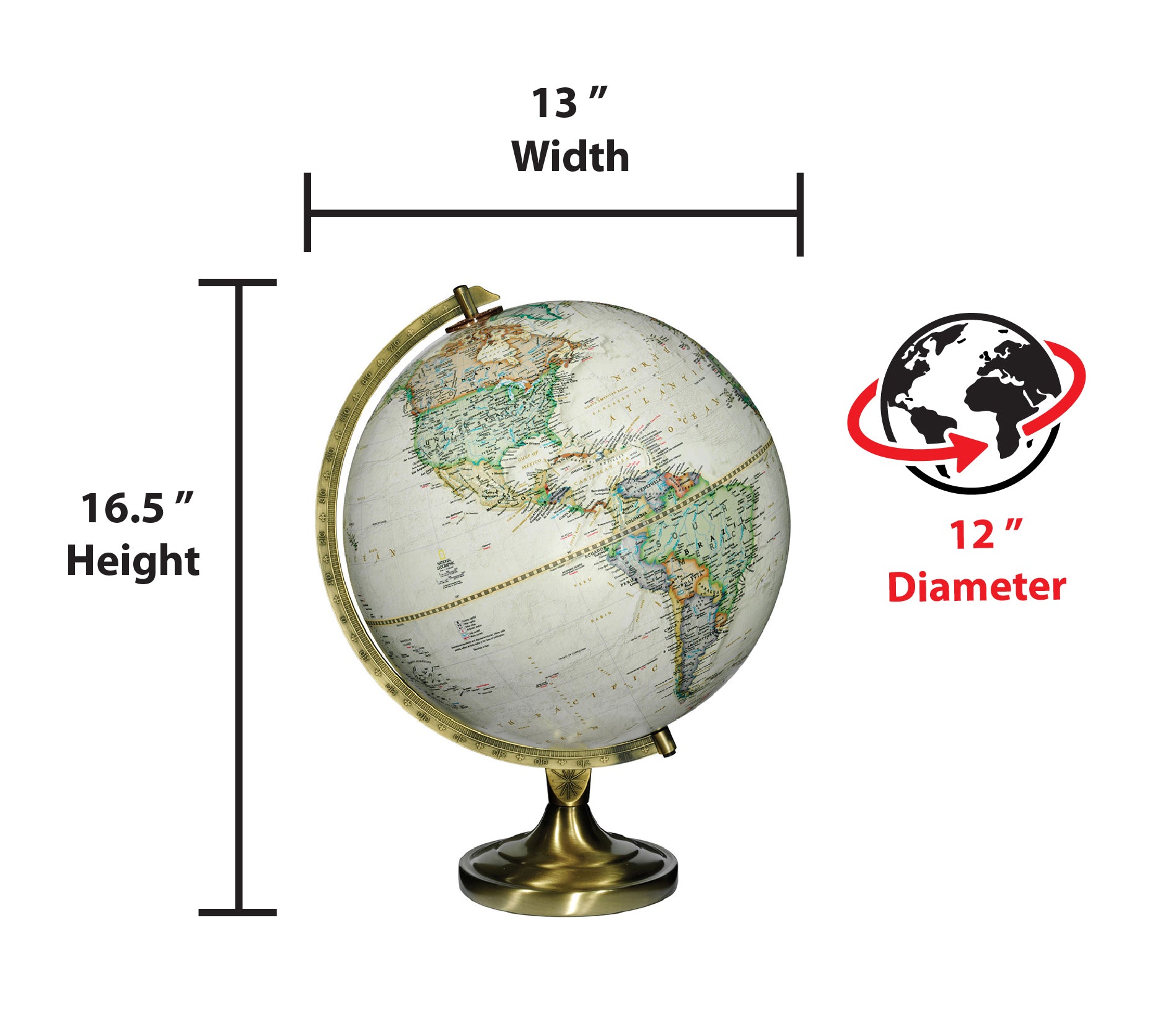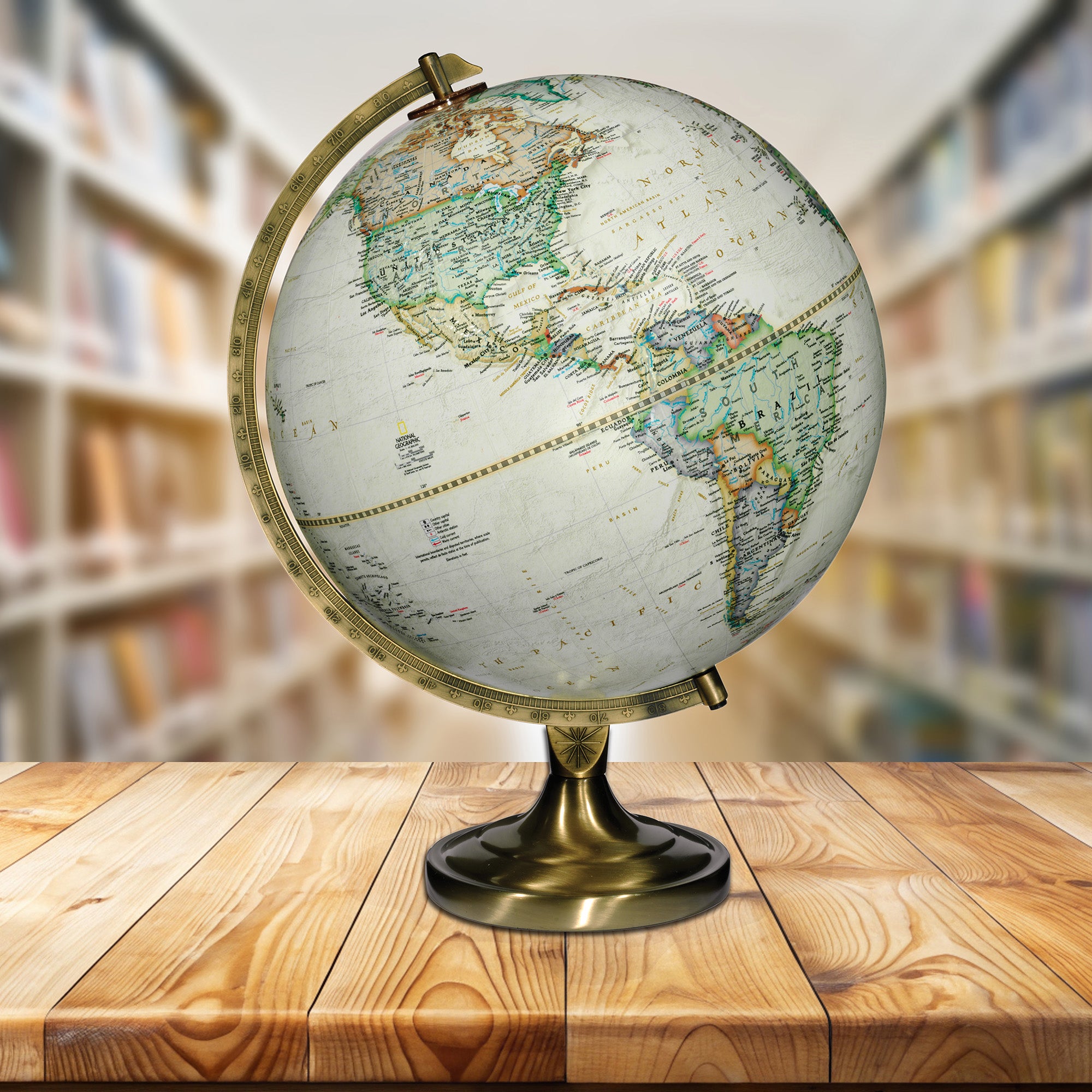 Grosvenor 12" Diameter National Geographic Cartography, with Mountain Relief, Antique Parchment Globe Ball and Sturdy Metal Base. The Grosvenor combines classic styling with the latest National Geographic cartography in colors reminiscent of parchment globes from centuries past. The Grosvenor  desktop-style presents a 12” raised relief globe that helps you gain a better perspective of our earth.Its antique brass plated semi-meridian and base provide functionality and  beauty. Perfect for office, study or living room.