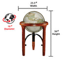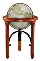 Jameson 16" Diameter Globe, USA Cartography with Raised Mountain Relief and Solid Wood Stand. The National Geographic Jameson globe features a 16” raised-relief, parchment style ocean globe ball which rests on a richly detailed solid hardwood stand with a full die-cast antique brass plated meridian. This beautiful stand features in-lay carvings on the legs and a heavy wrought iron metal stretcher that gives this globe its bold, distinctive design.