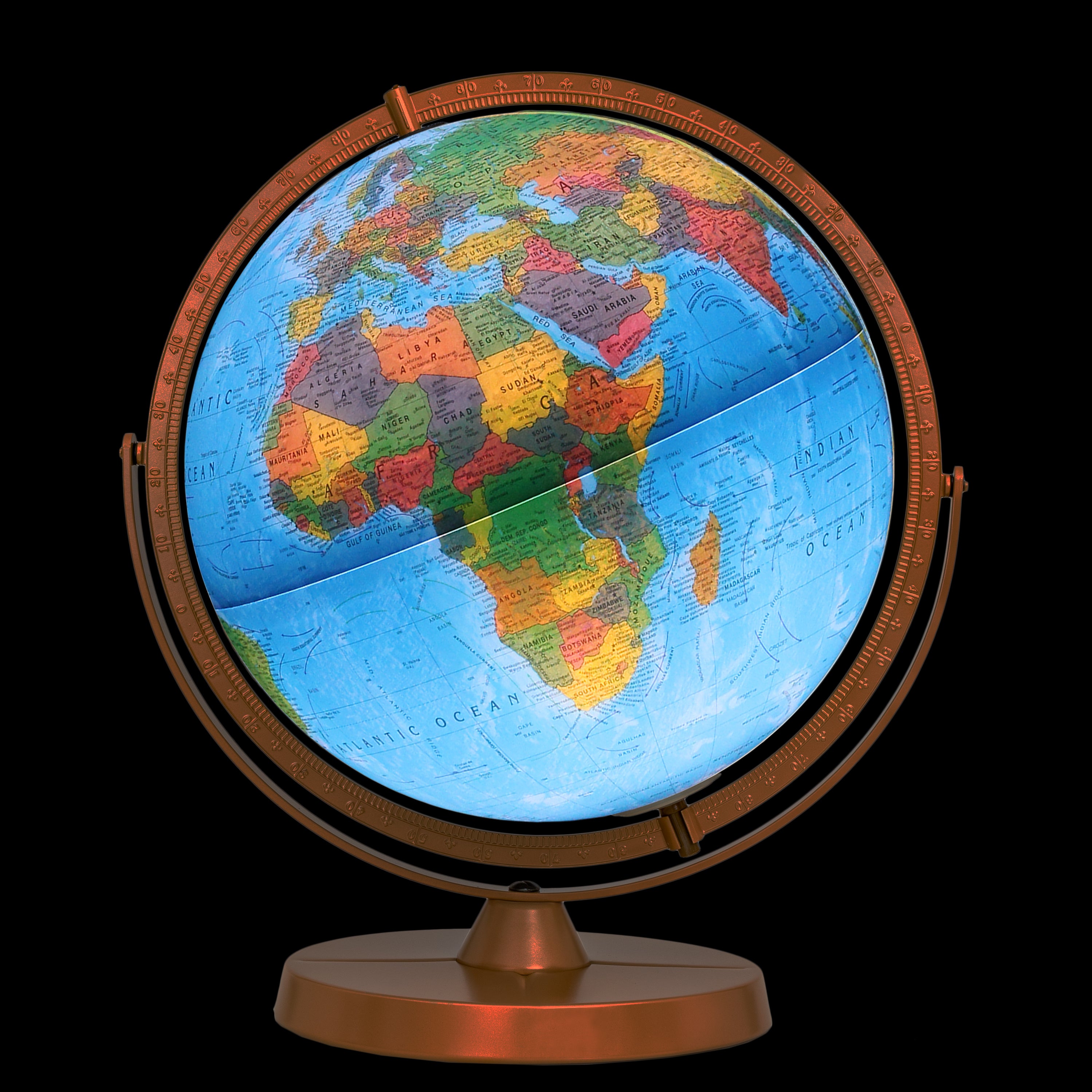 - Globe ball is held by sturdy metal base and numbered full meridian