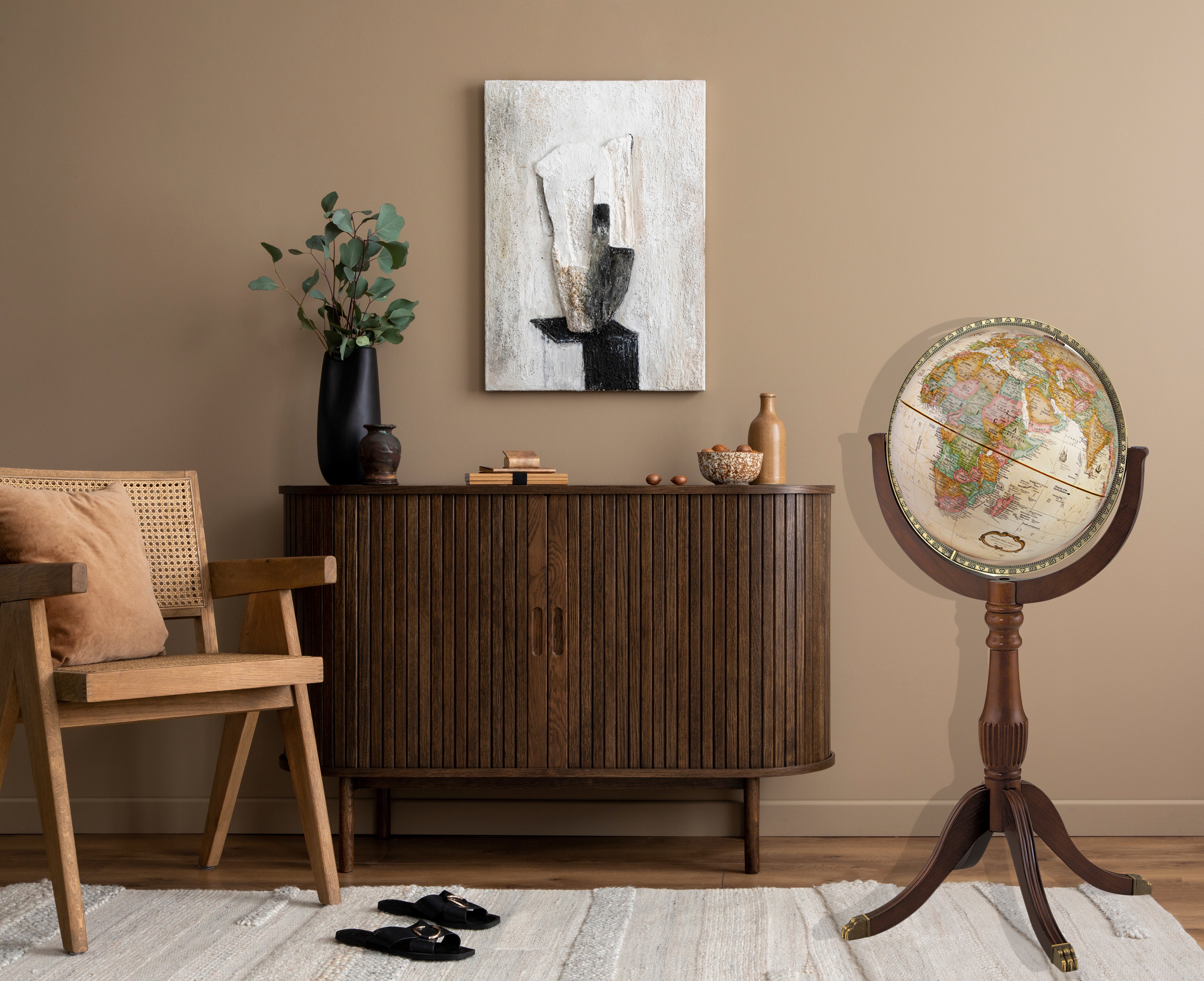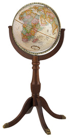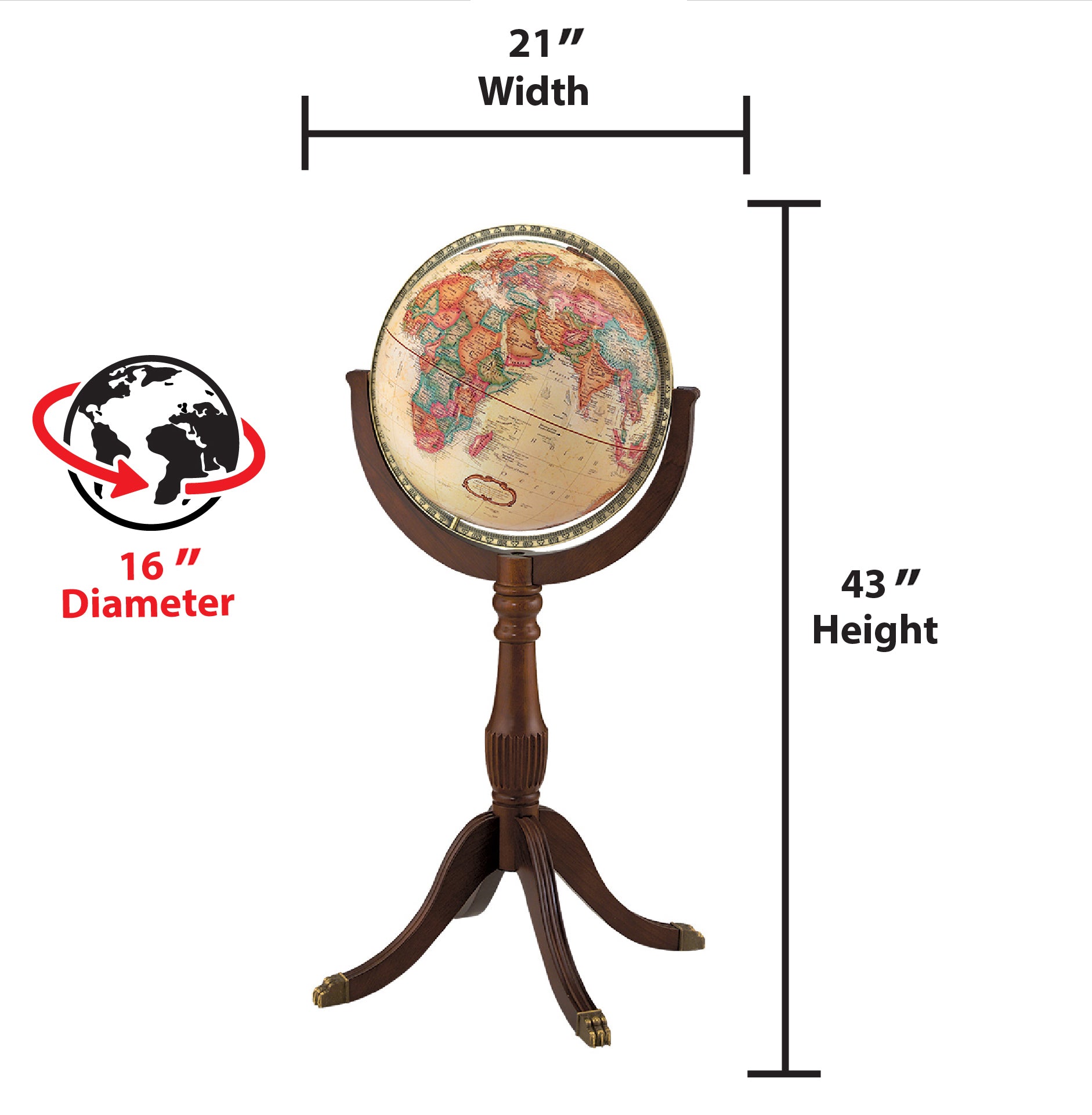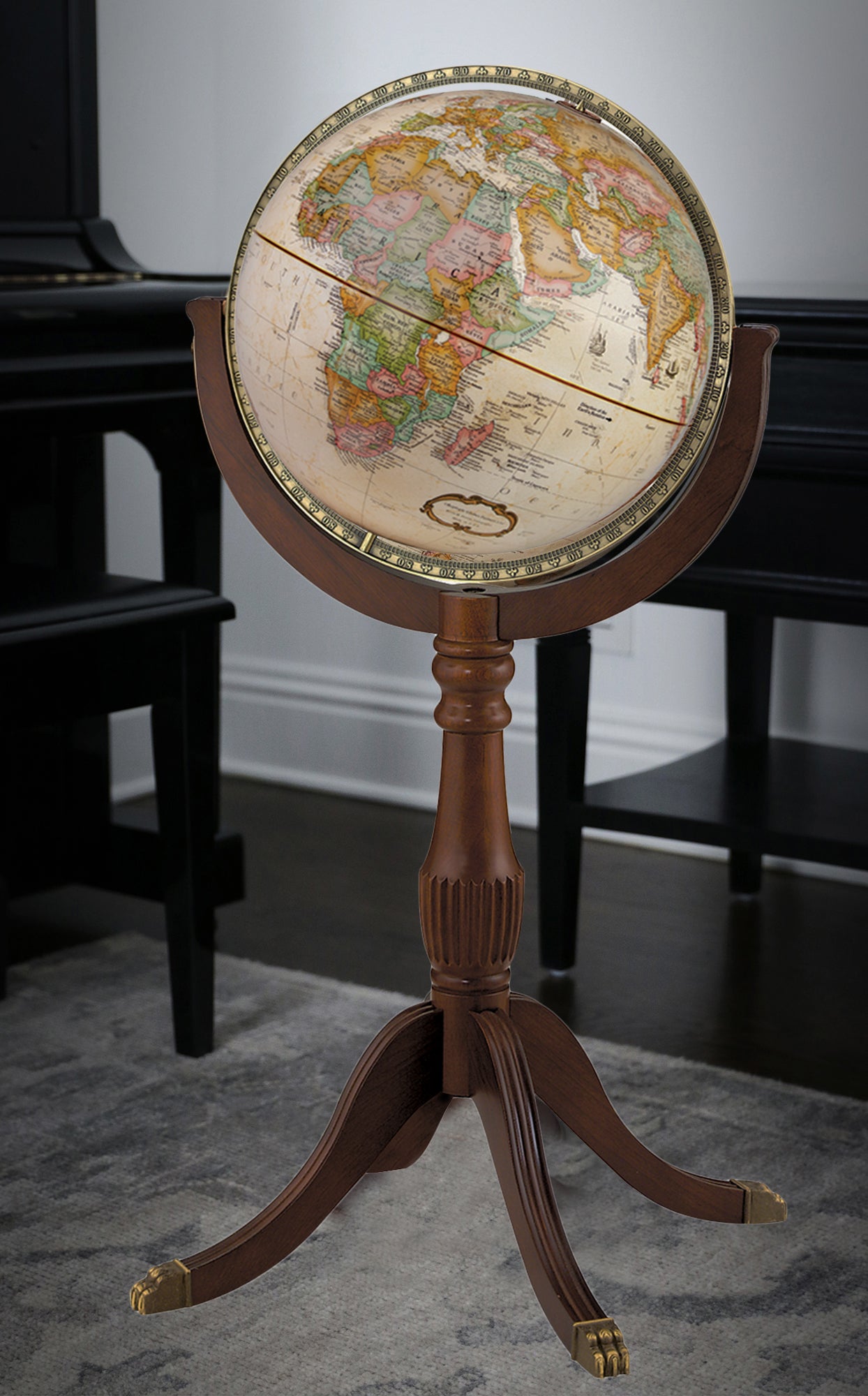 Sherbrooke II Globe, 16-Inch Diameter, USA Cartography. Solid Hardwood Cherry Stained Stand with Full Numbered Diecast Meridian. Transport yourself to a different land and time. The globe ball features decorative cartouches and ornate compass roses. The Sherbrooke II features An elegant cherry-finish solid wood stand with brass claw feet. Perfect for any room.
