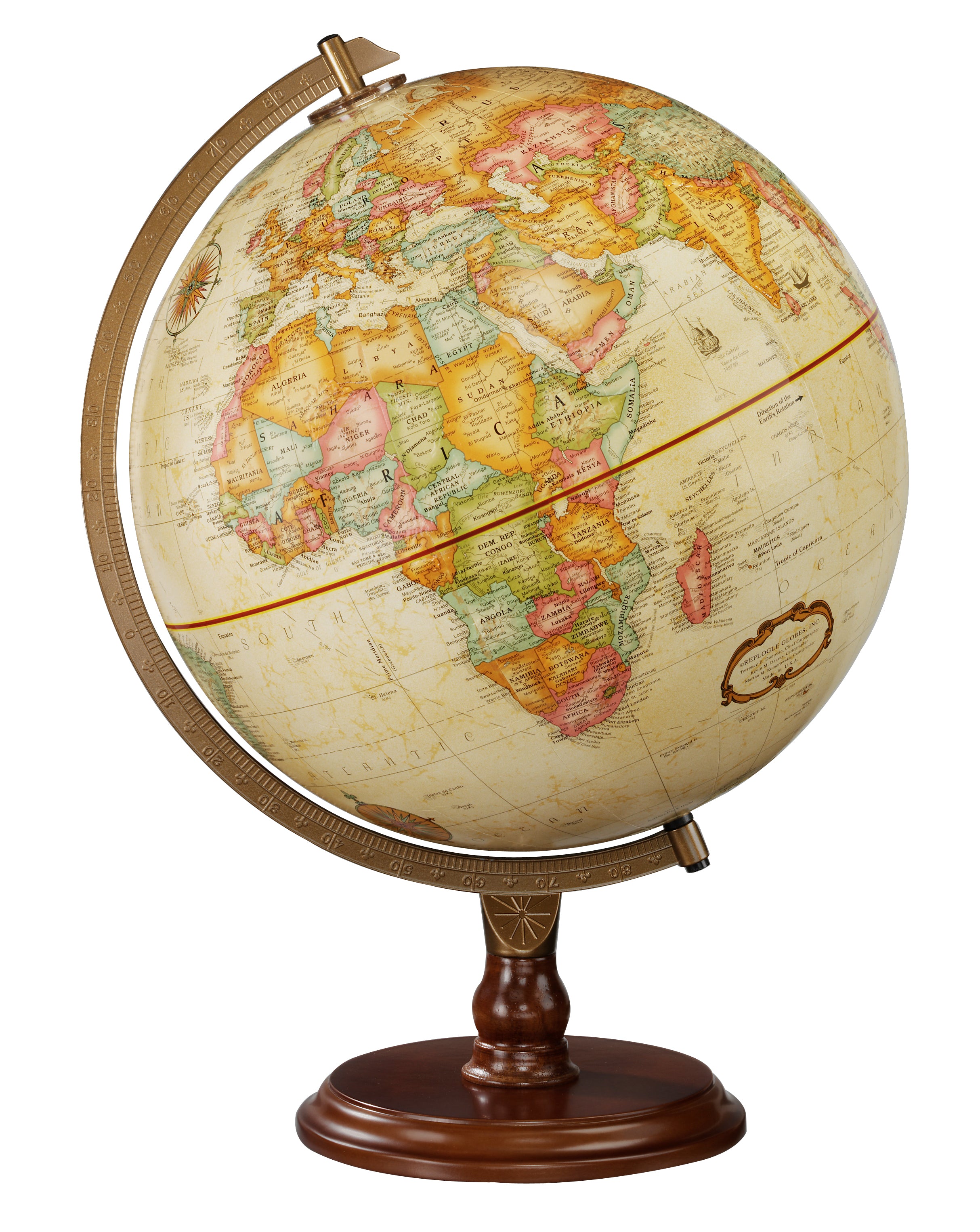 - Globe ball is held by sturdy wood base and numbered semi-meridian
