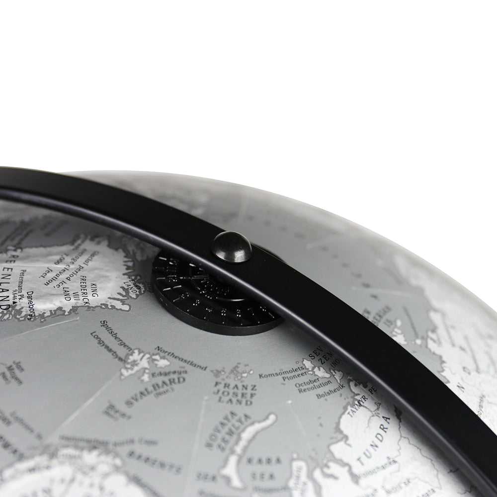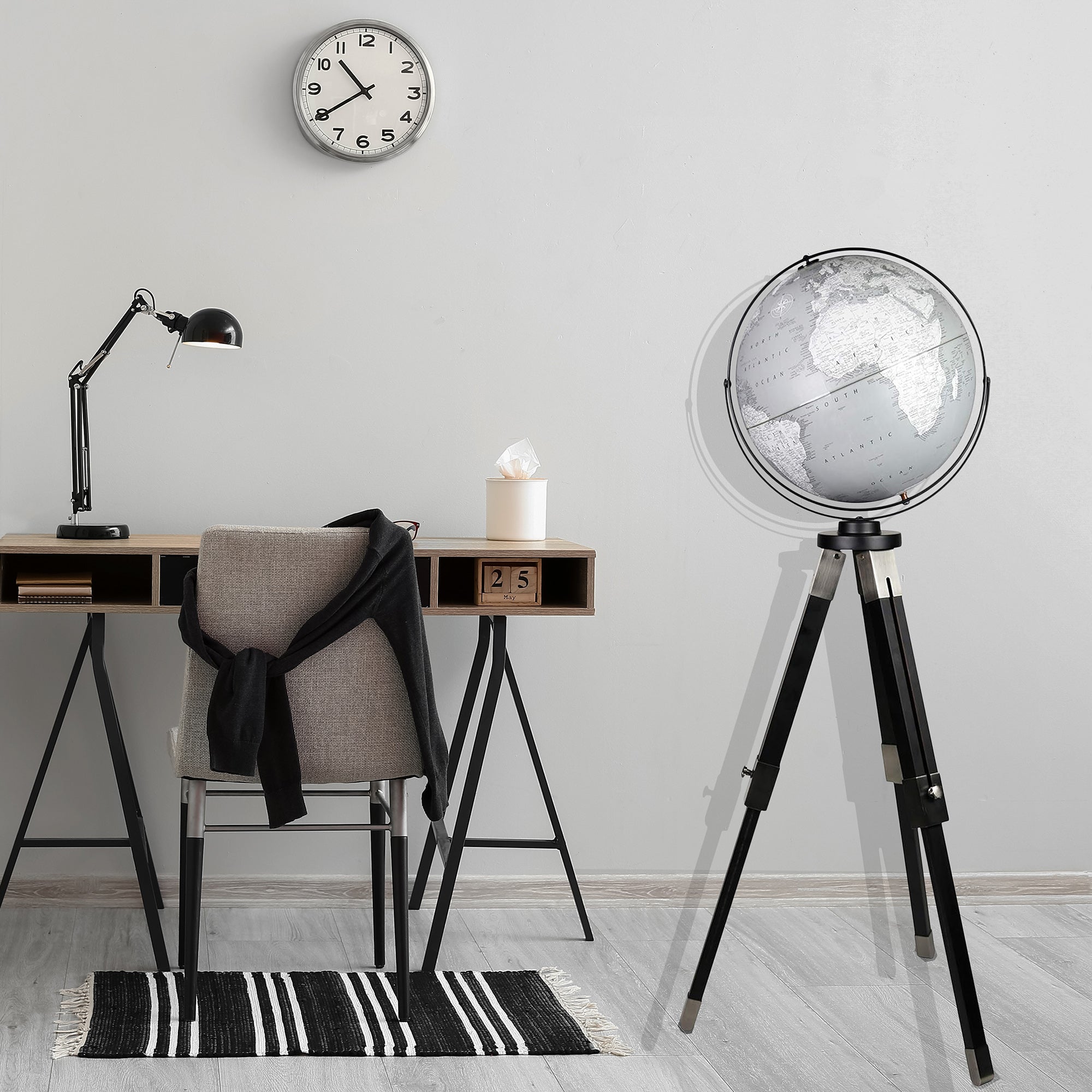 Willston 16" Diameter Globe, USA Cartography with Raised Mountain Relief and Sturdy Metal Stand.. Unique and modern! The Willston features a clean, grey map with half tone colors. The raised relief embossing provides 3D like texture that both educates and captivates. This large 16" map complements a black tripod stand, with brushed nickel hardware. The tripod stand allows for five height variations. The full meridian enables 360 degree viewing of this fabulous globe that features over 3,500 place names and boundary markings.